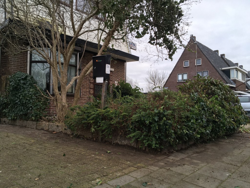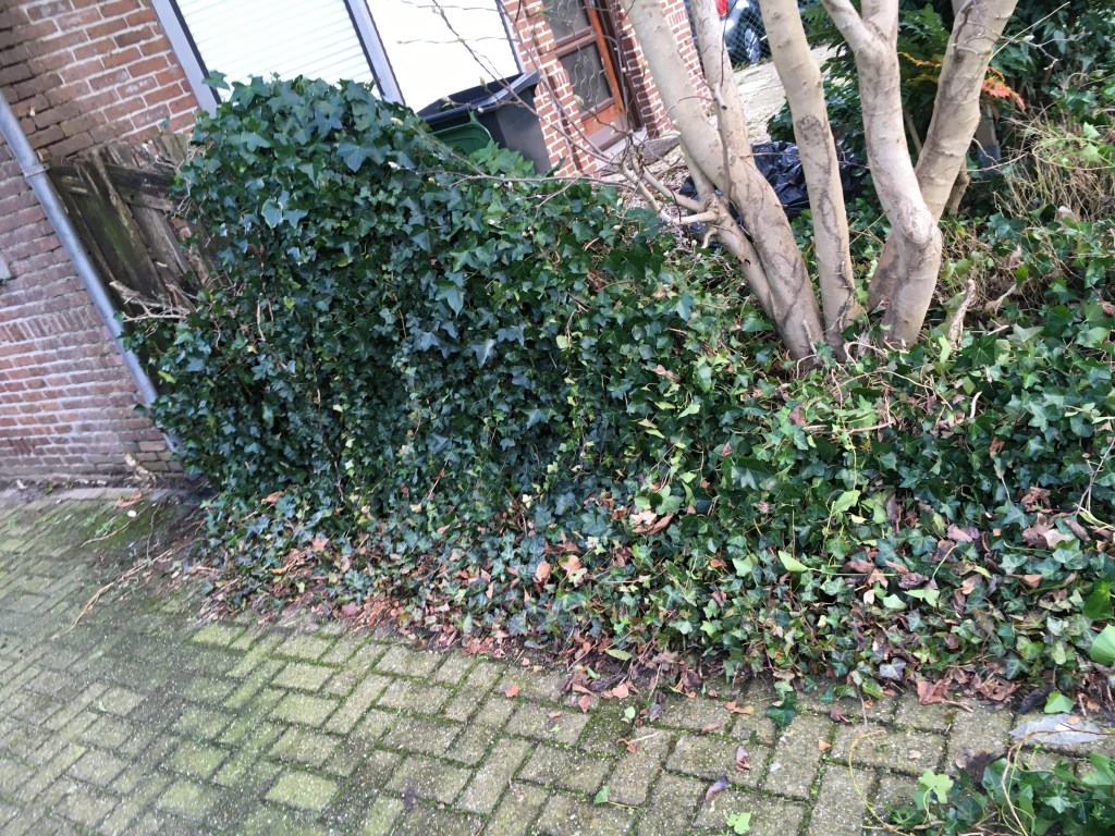 Overwoekerde schutting en flink veel klimop op de oprit van de buren!