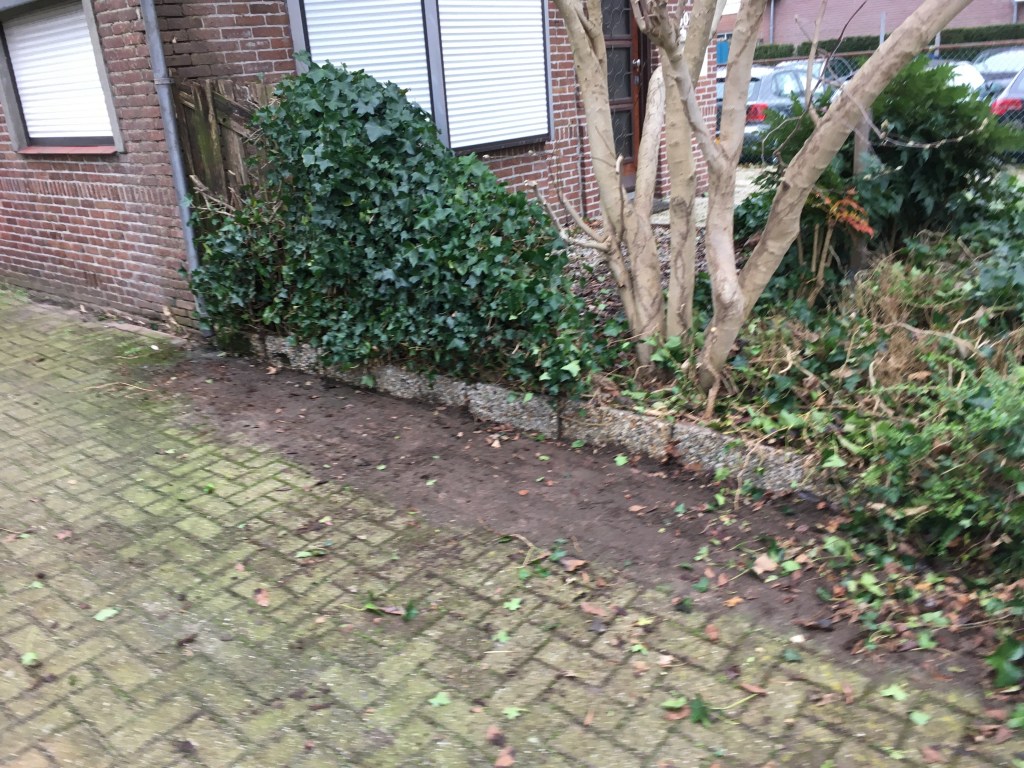Ongewenste groen? Ja. De klimop is namelijk behoorlijk uit zijn krachten gegroeid. Het huis zat er flink onder (maar dat hebben we eerder al aangepakt, zoals hier te lezen is), de boom in de voortuin was voor tweederde overwoekerd en ook in de achtertuin is het flink losgegaan, vooral bij de schuur en de muur die aan de brandgang grenst.