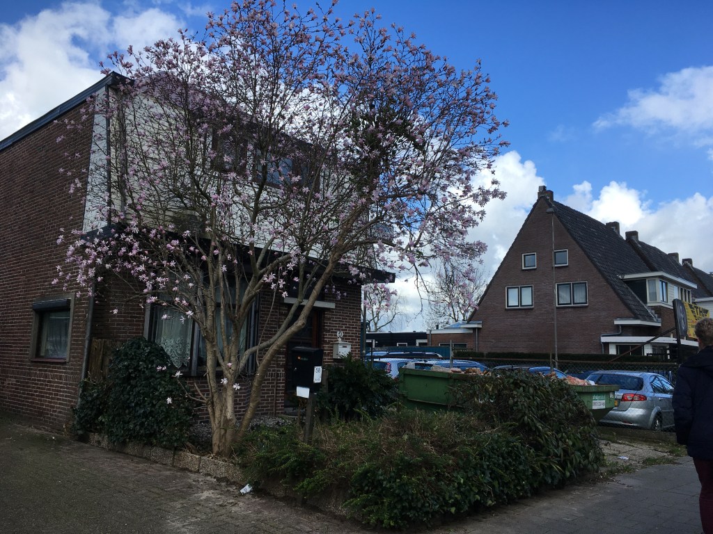 De boom in de voortuin, sinds gisteren totaal vrij van klimop, is uitbundig aan het bloeien en blijkt een magnolia te zijn!