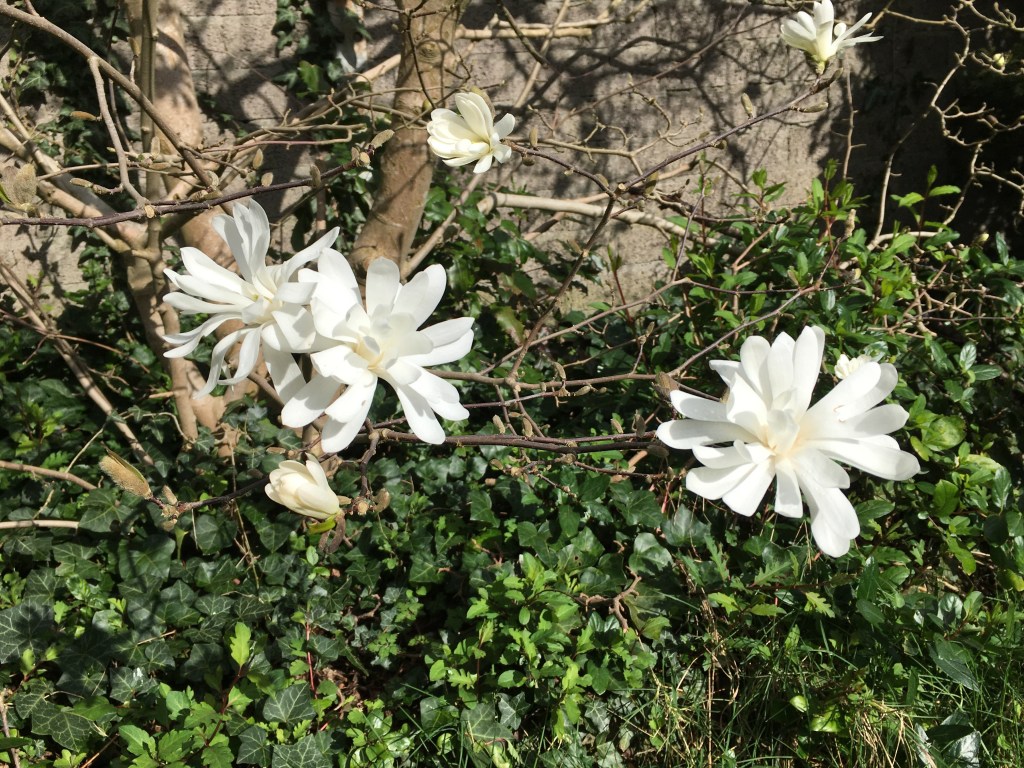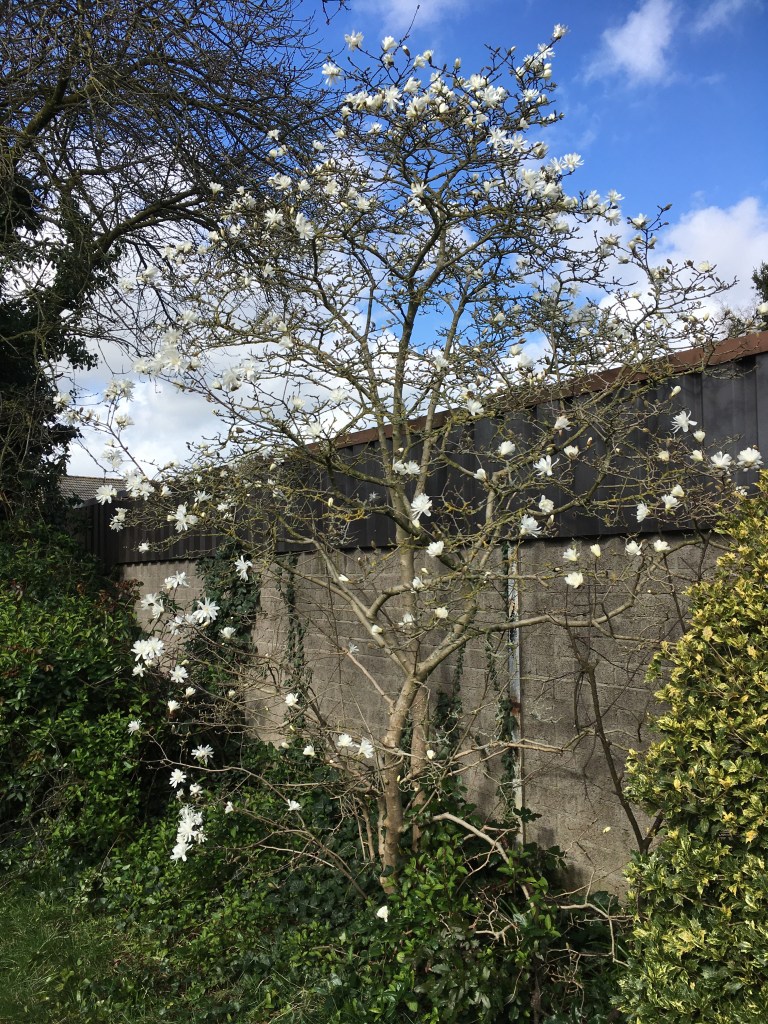 Ook in de achtertuin staat een magnolia al is deze wat kleiner en heeft witte in plaats van roze bloesems.