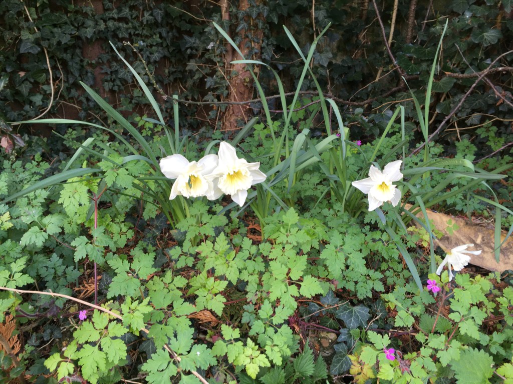 En iemand heeft ooit krokussen neergezet die nu ook weer tevoorschijn komen.
