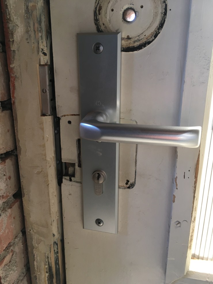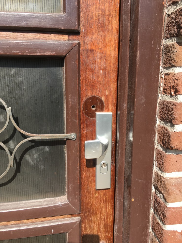 Het beslag oogt nog veel moderner dan de rest van de deur, maar nieuw glas en een verfje staan nog in de planning (alleen niet op korte termijn).