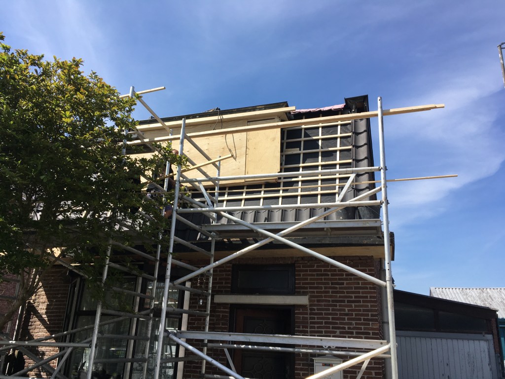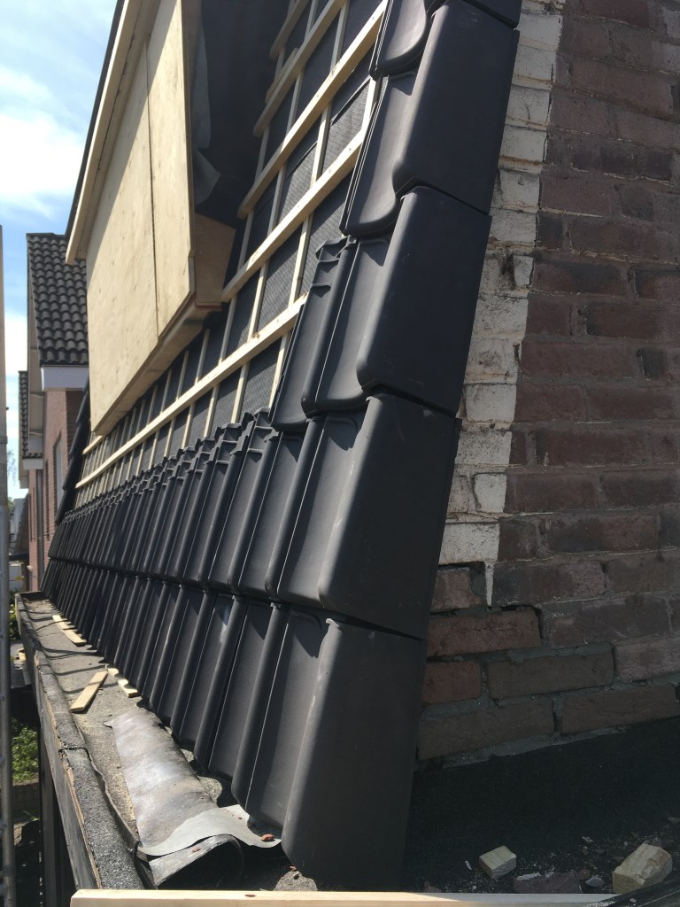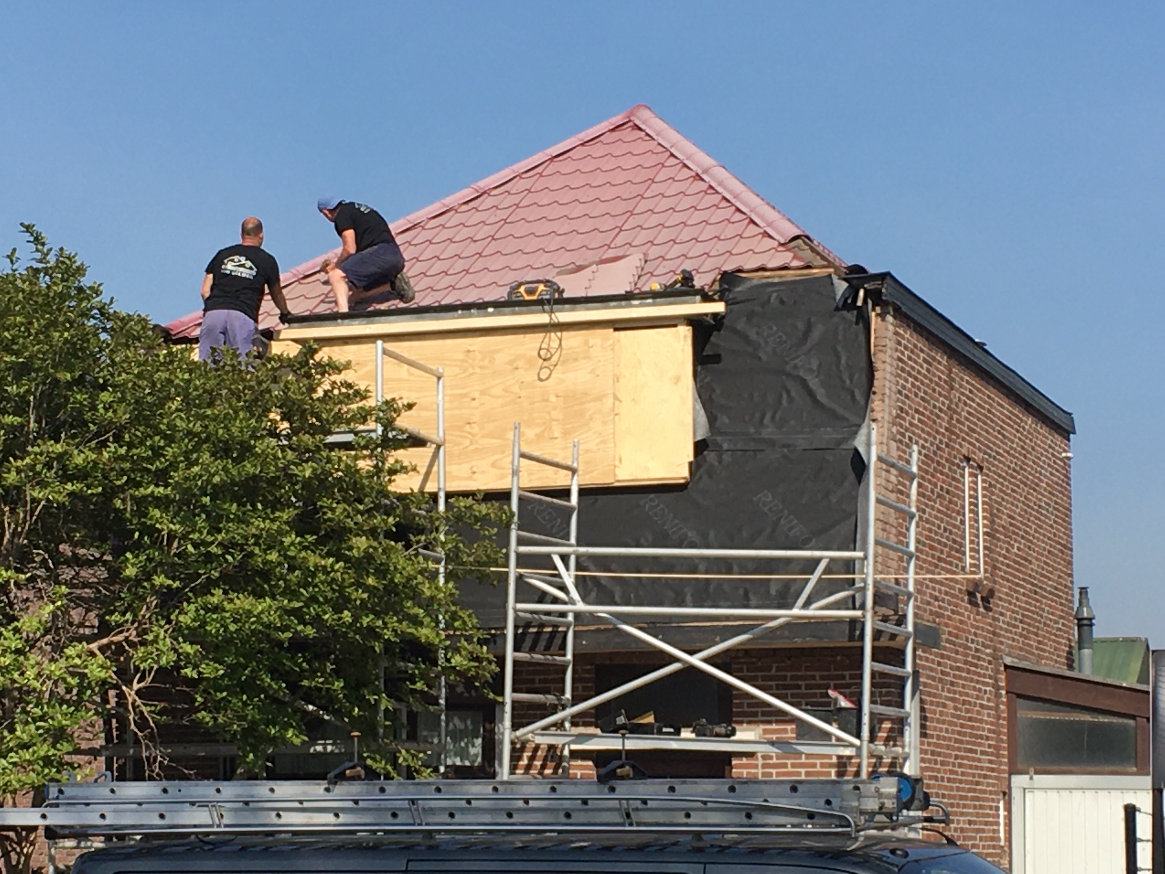 Hierna zijn eerst de pannen aan de zijkant, met een soort ‘overhang’ bevestigd. De pannen aan de voorkant zullen uiteindelijk allemaal vastgeschroefd worden, zodat we niet bang hoeven te zijn dan ze er af vliegen de eerstvolgende storm.
