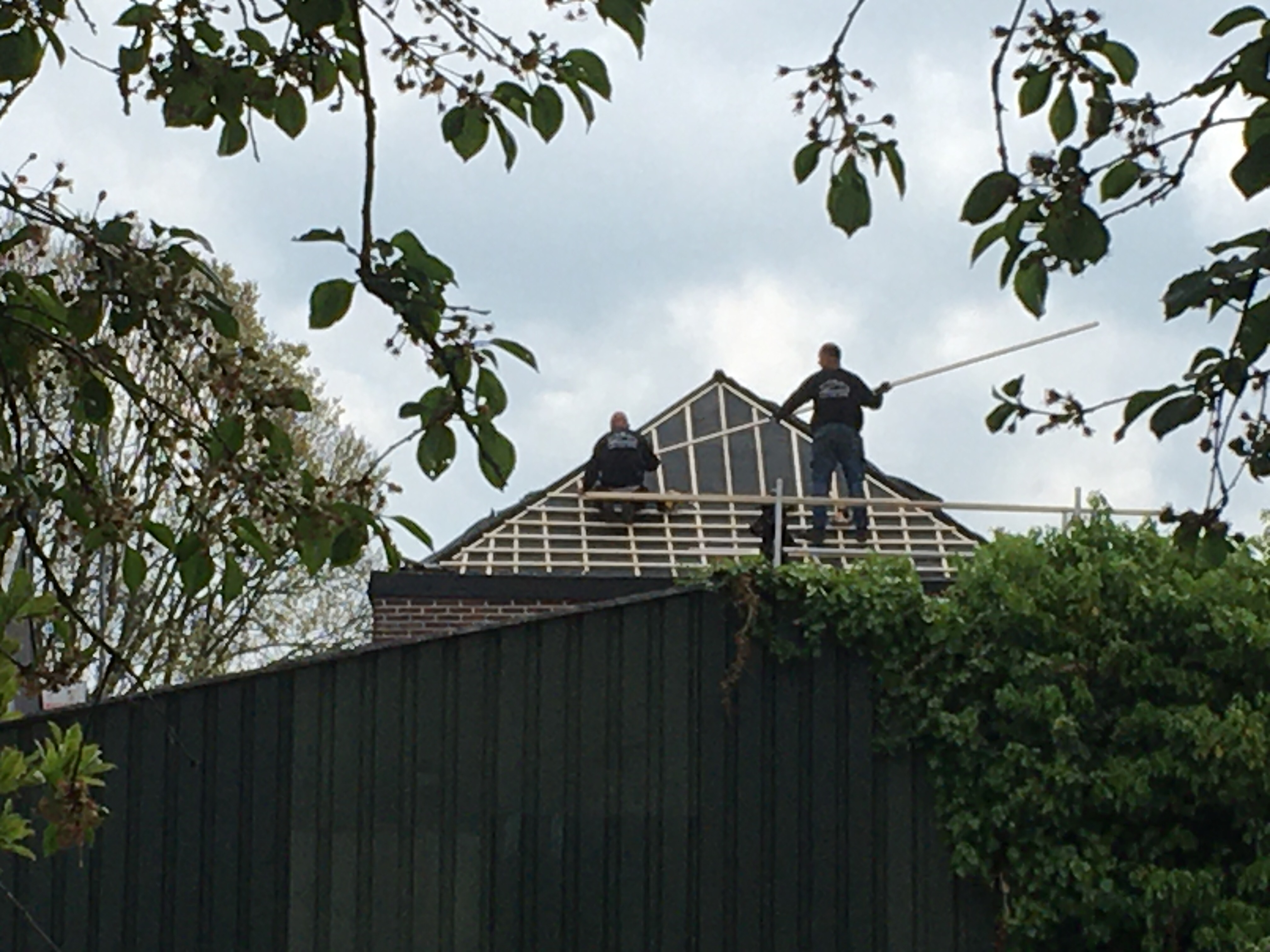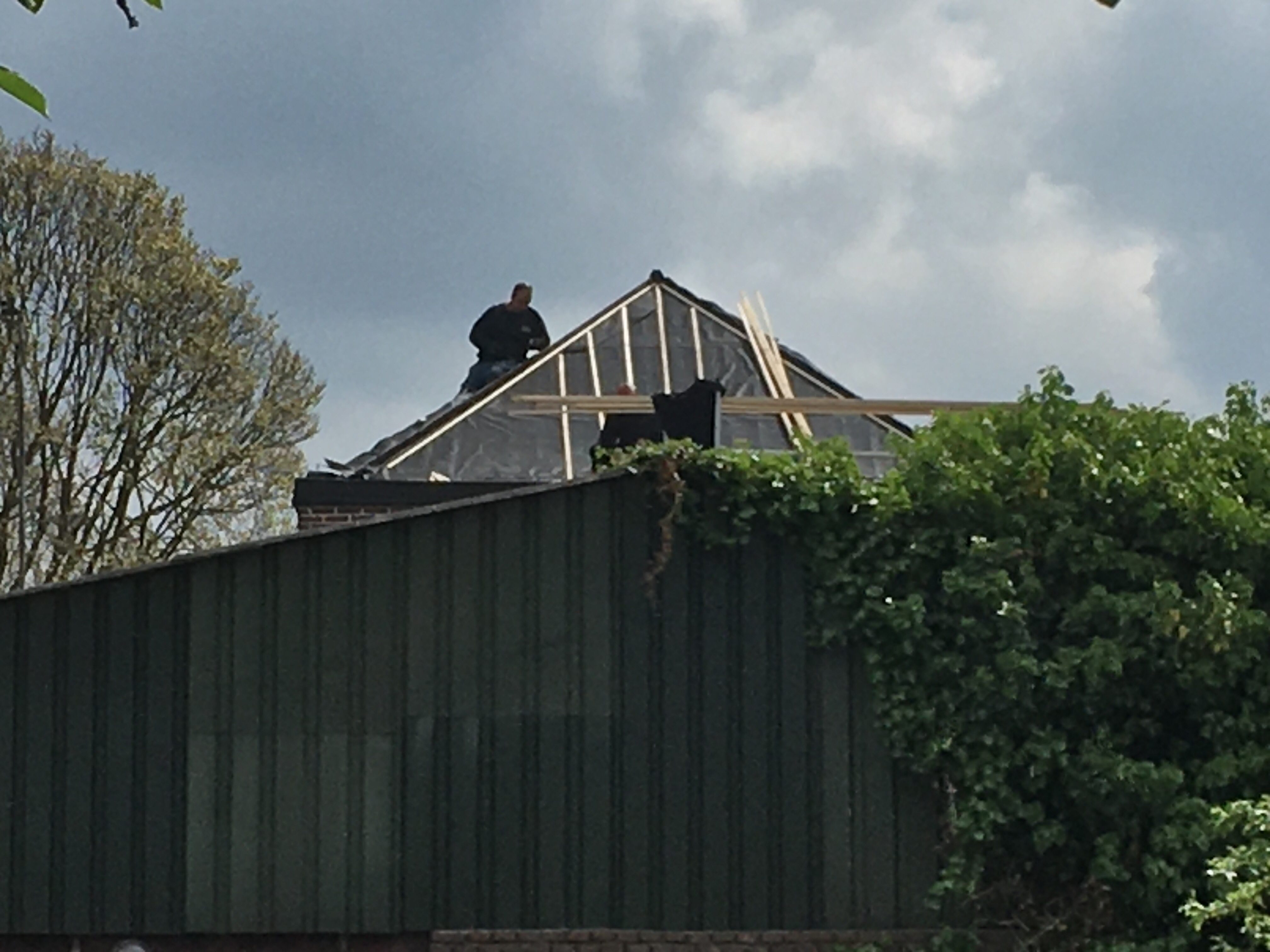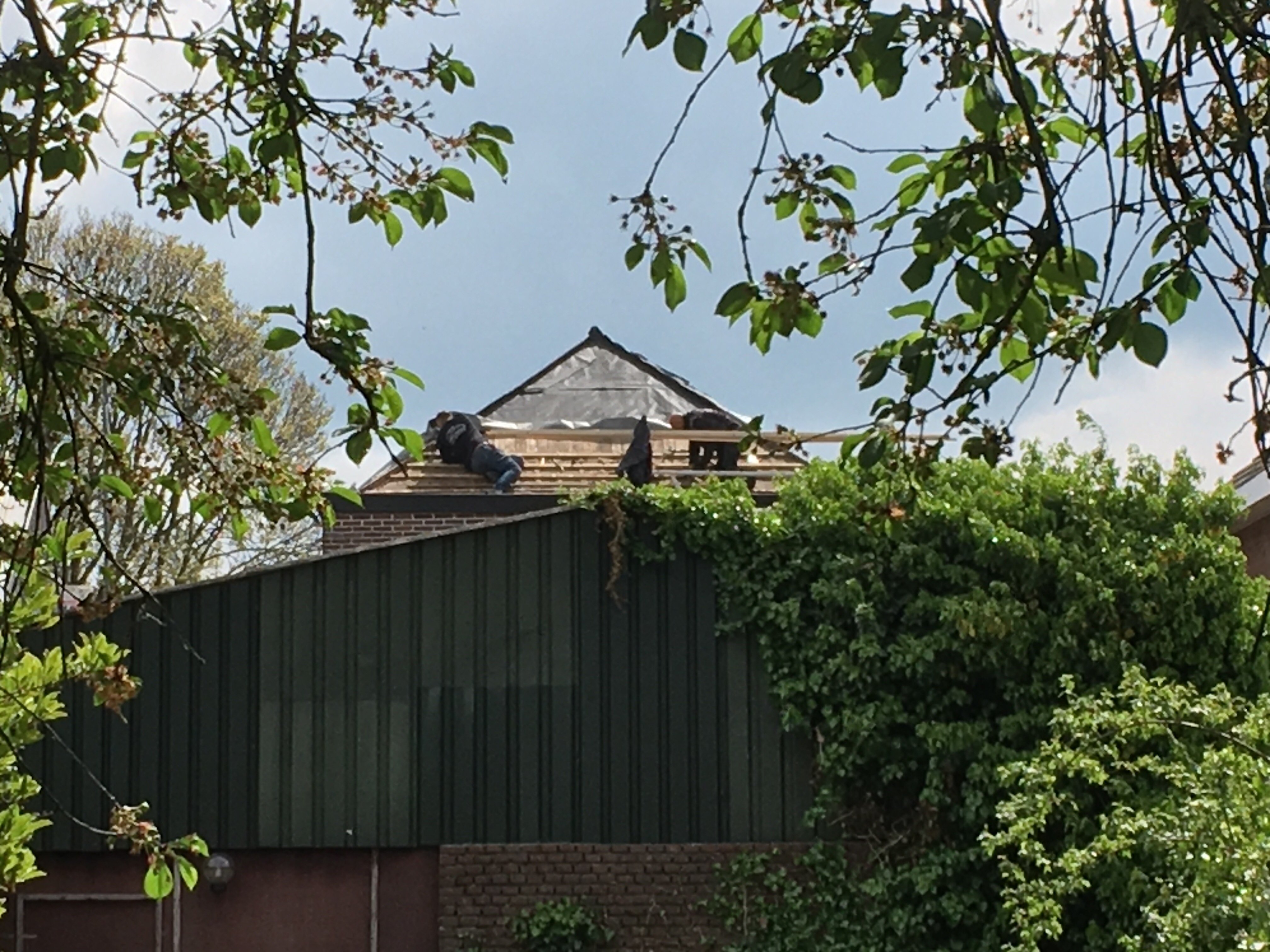 Na deze grijze dag zijn inmiddels drie van de vier zijdes van het dak bovenop voorbereid voor de nieuwe pannen.