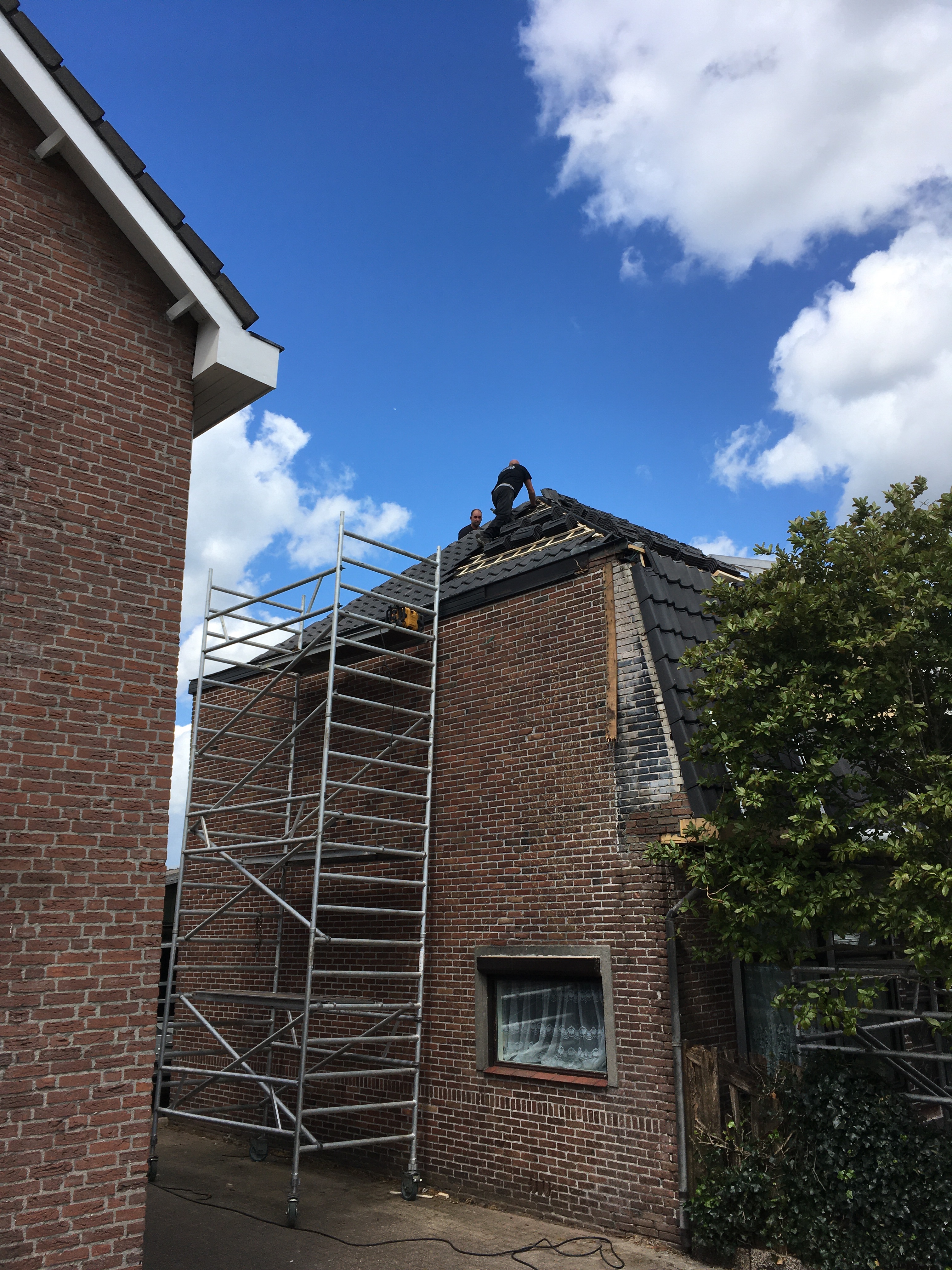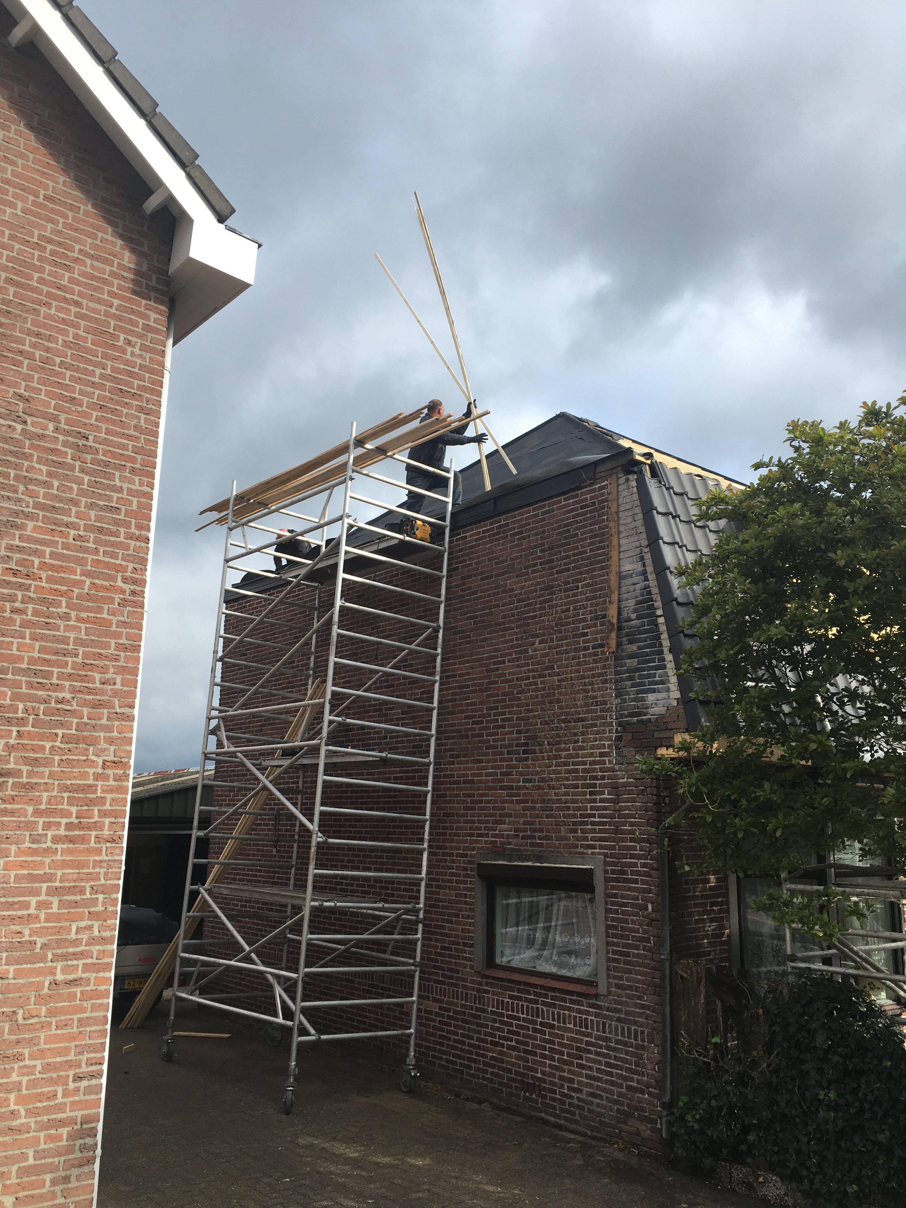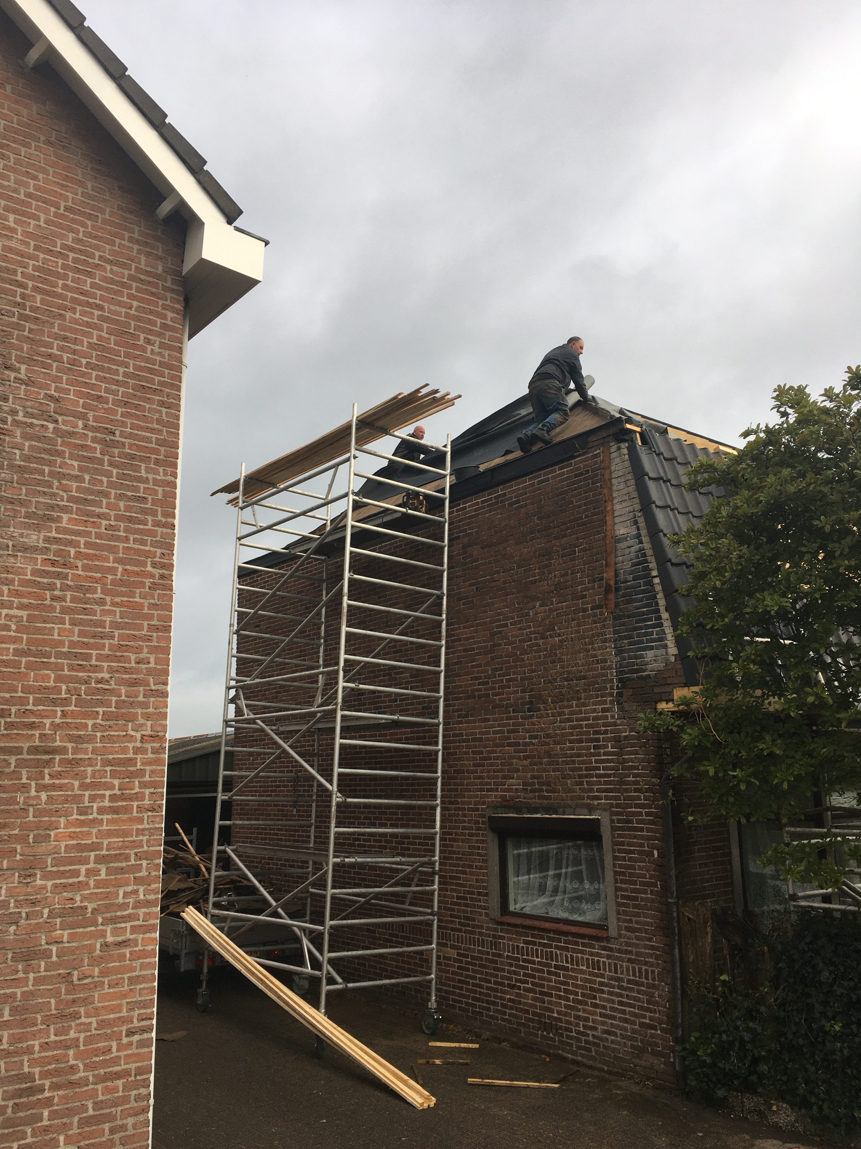 ‘s Ochtends hebben Franks de laatste zijde van het dak klaargemaakt voor de nieuwe pannen.