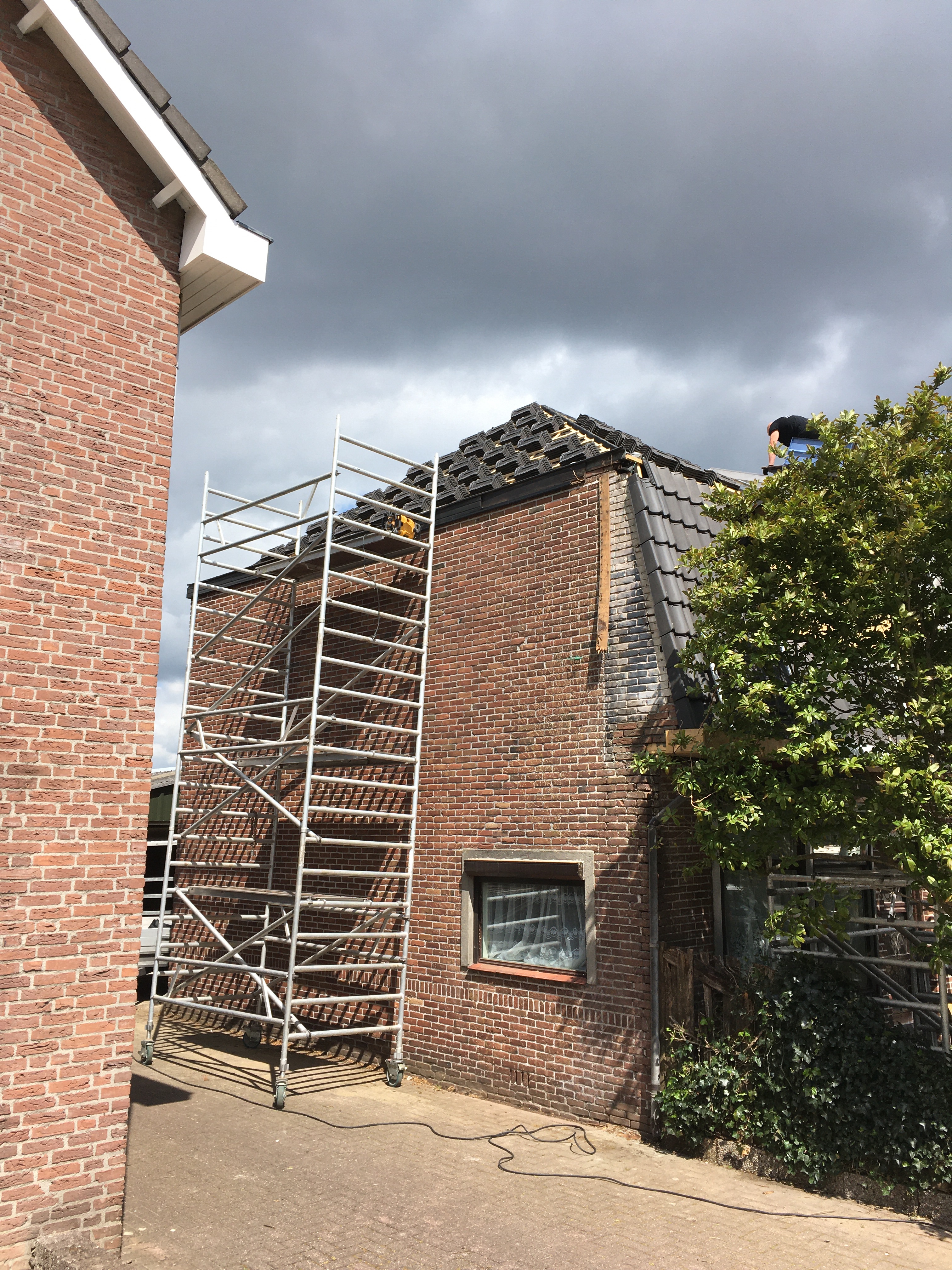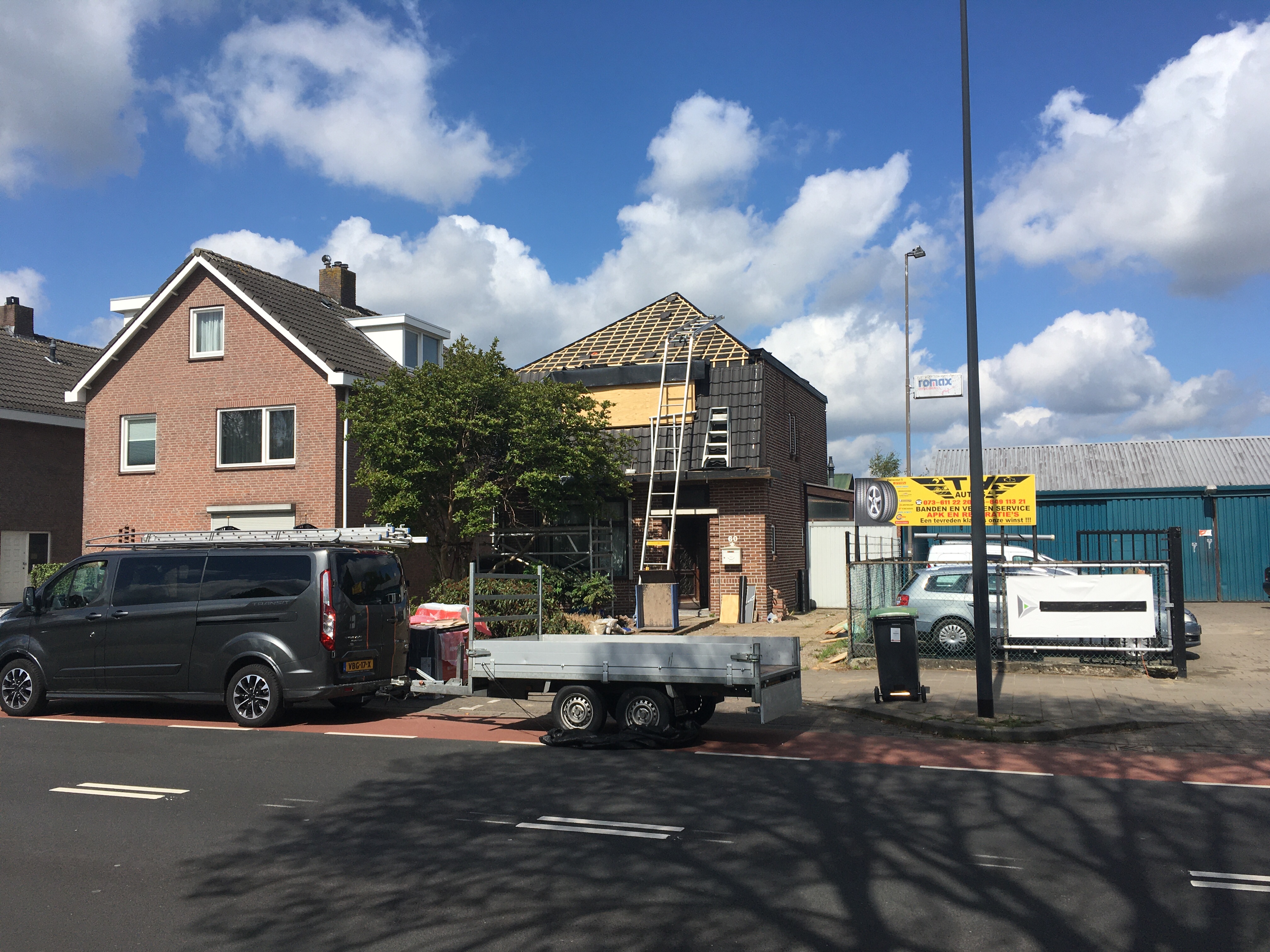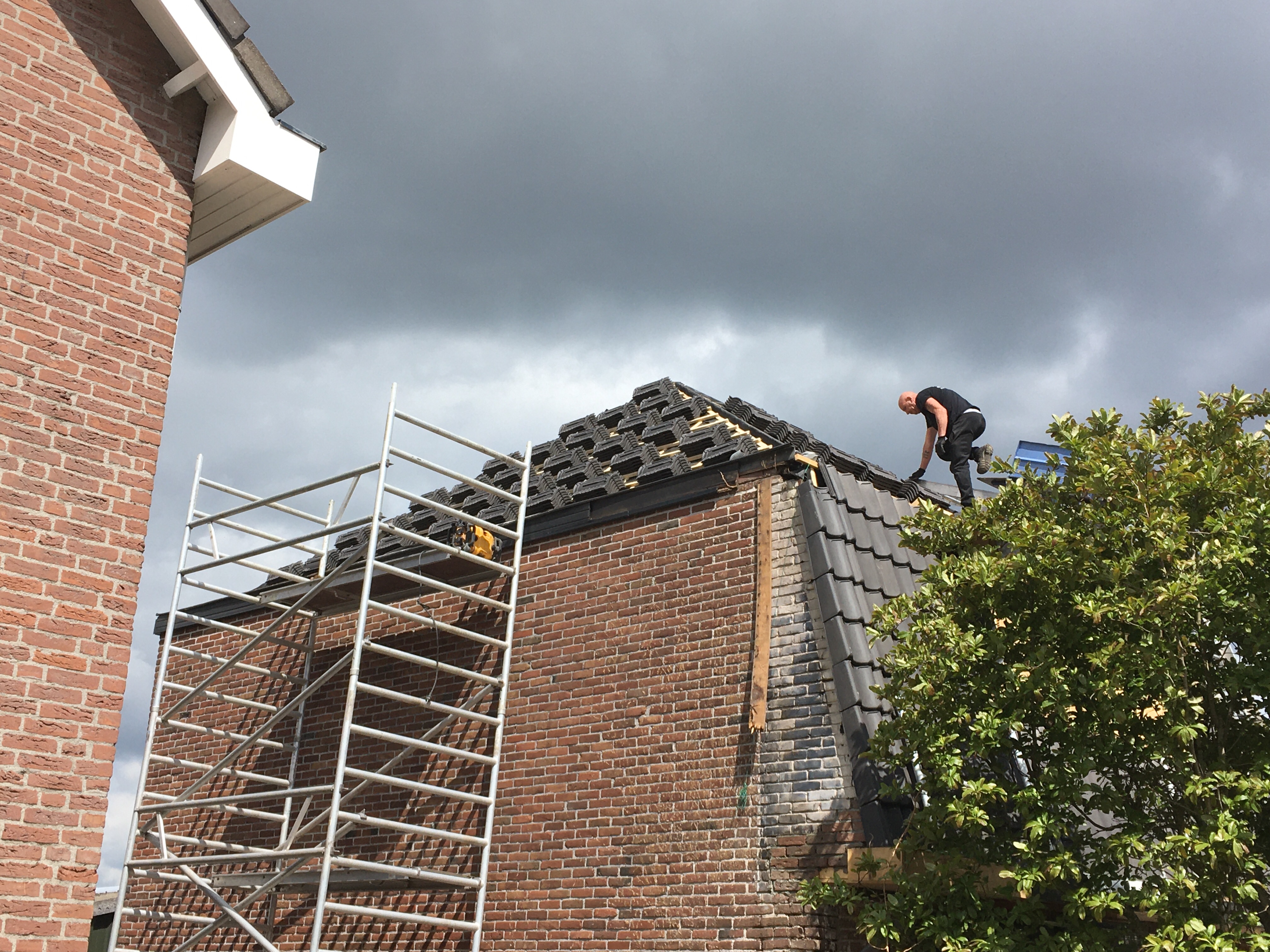 ‘s Ochtends hebben Franks de laatste zijde van het dak klaargemaakt voor de nieuwe pannen.