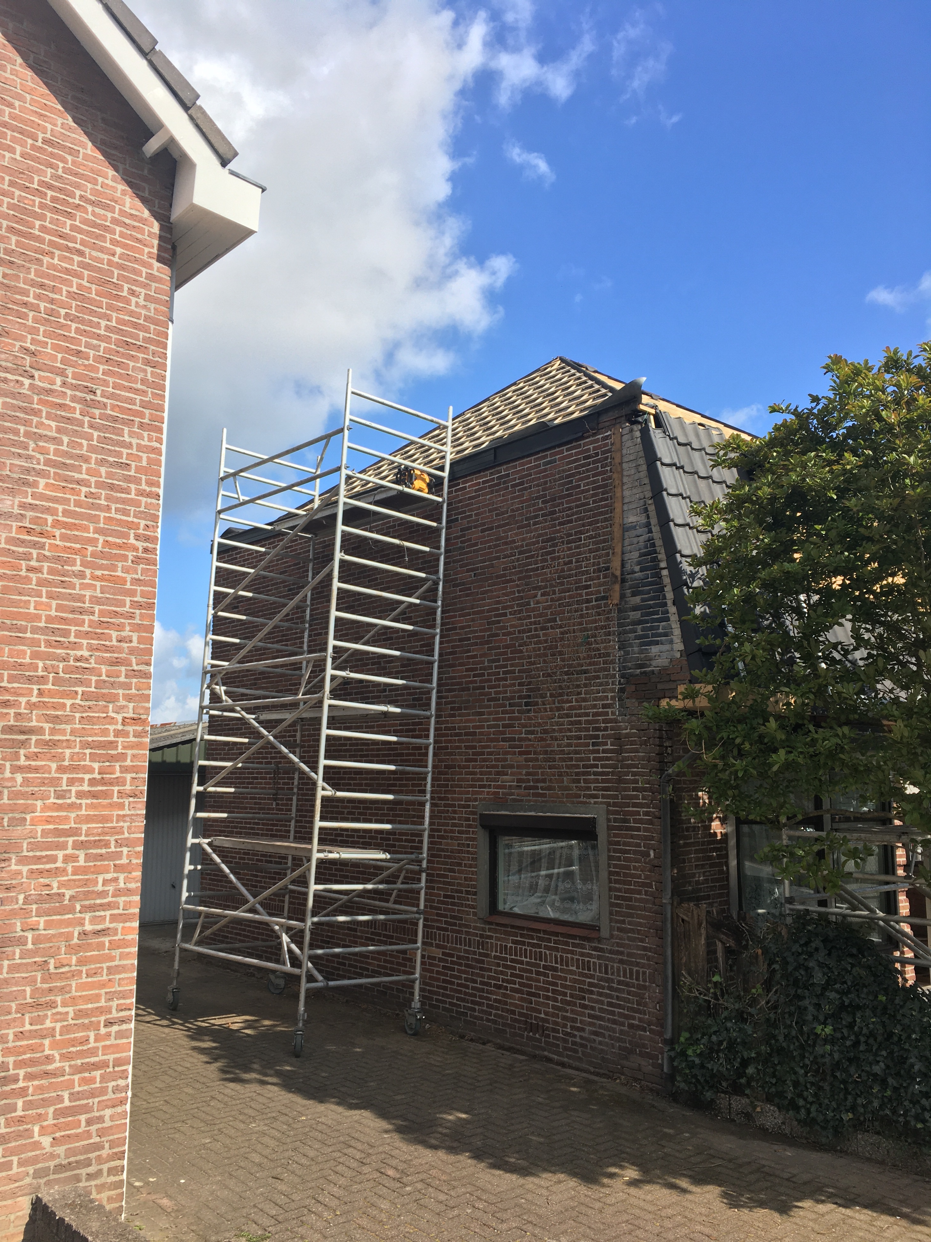 Daarna hebben ze een pannenlift gehaald en ongeveer driekwart van de dakpannen naar boven gebracht.