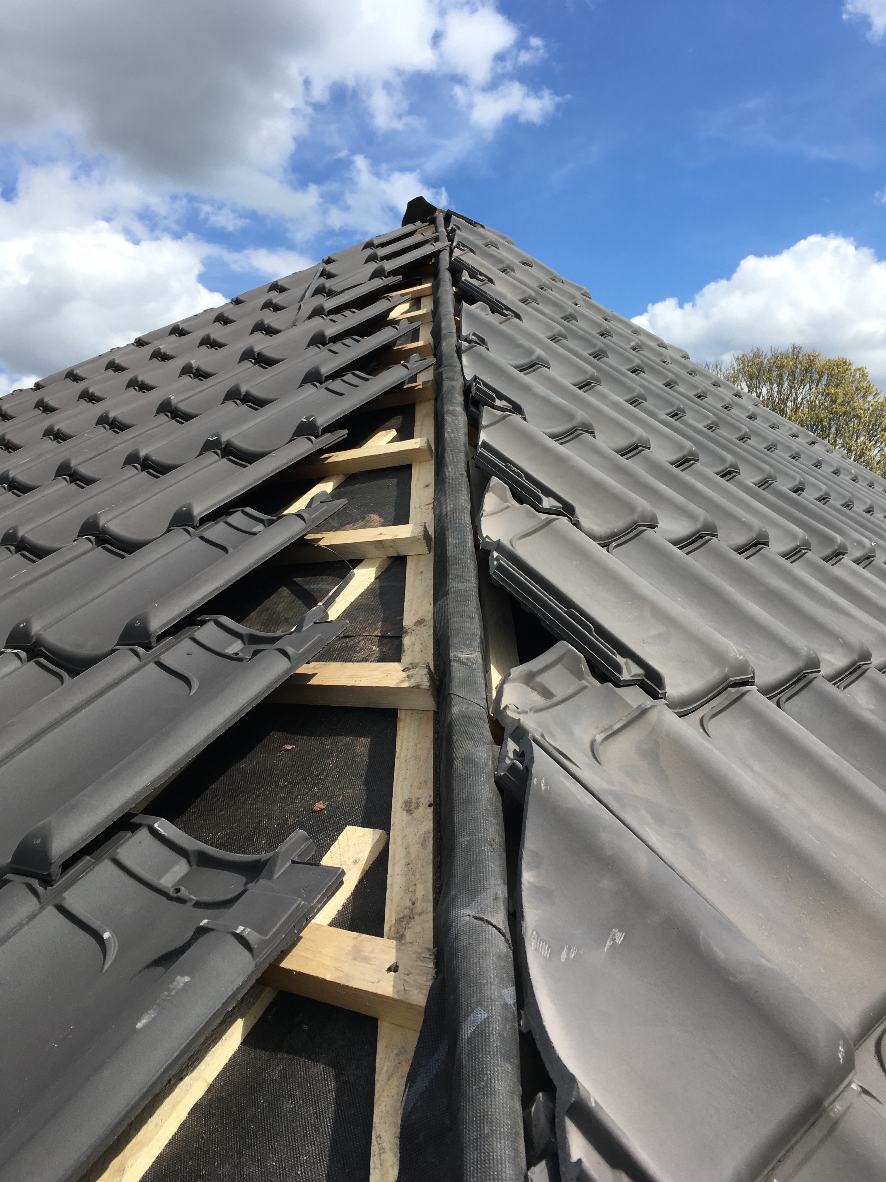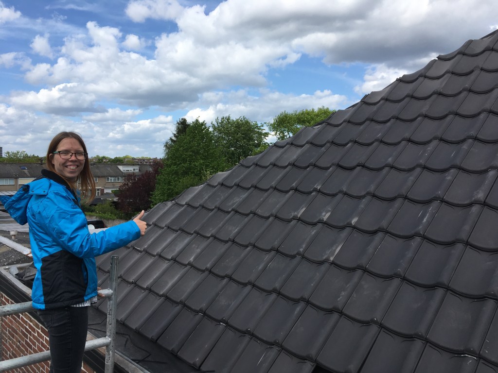 En meteen begonnen met het leggen. Eerst de hele dakpannen aan de achter- en zijkant, daarna alle pannen aan de uiteinden diagonaal afzagen (alleen nog aan de zijkant) zodat het straks allemaal mooi onder de nokvorsten valt.