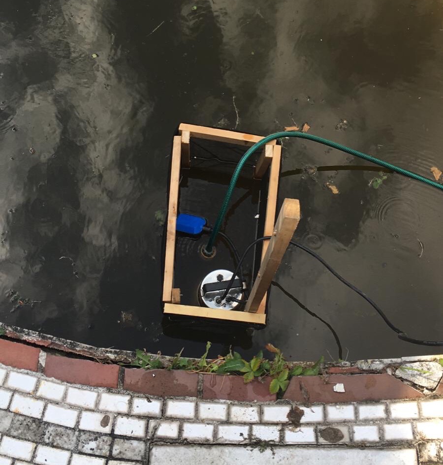 De pomp stop als het water gezakt is tot een centimeter of 8, dus er is daarna nog wel wat werk te doen.