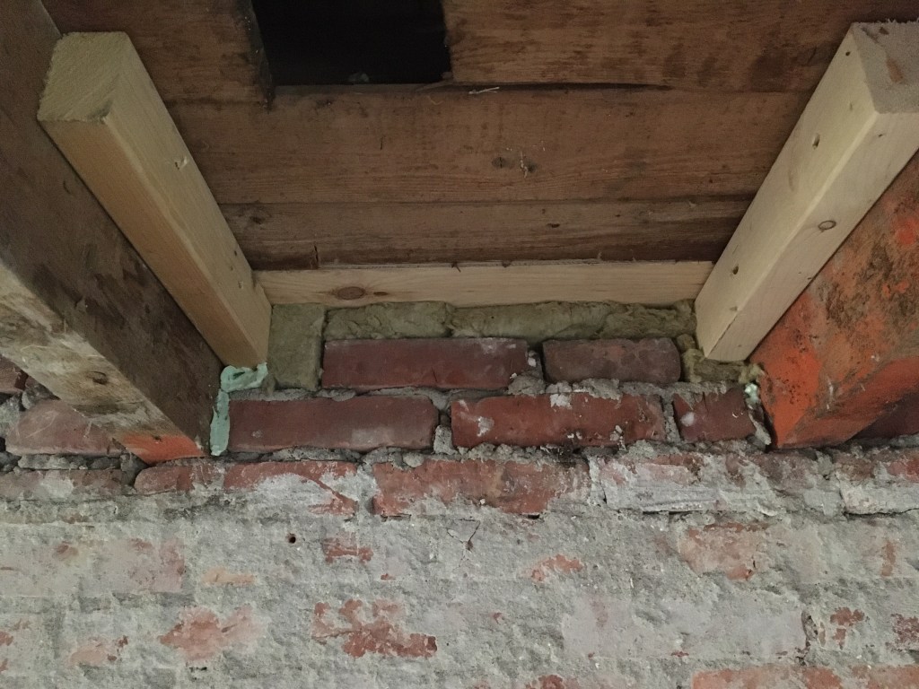 De balken zelf steunen dus op de muur, en de dakgoot en dakdelen steunen weer op de balken. De bakstenen tussen de balken hebben dus geen dragende functie, en zijn op veel plaatsen slordig geplaatst of ontbreken zelfs. Om het huis verder qua isolatie in 2020 te brengen hebben we alle ruimtes opgevuld waar mogelijk met steenwol. Waar dat niet mogelijk was hebben de randjes met PUR gevuld.