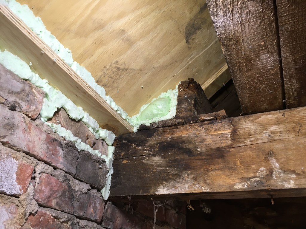 Probleem is echter we er niet bijkunnen, behalve op plekken die al open zijn zoals bij het gat van waar de schoorsteen zat. De oplossing: elke 20cm een gat in het houtwerk boren en daardoor de ruimte er achter vullen met PUR-schuim!