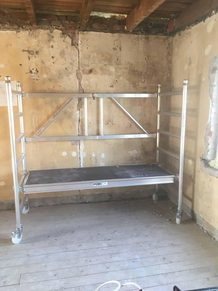 Omdat we ook de plafonds overal gaan aanpakken, hebben we het onszelf gemakkelijk gemaakt, en hebben we een opklapbare kamersteiger aangeschaft!