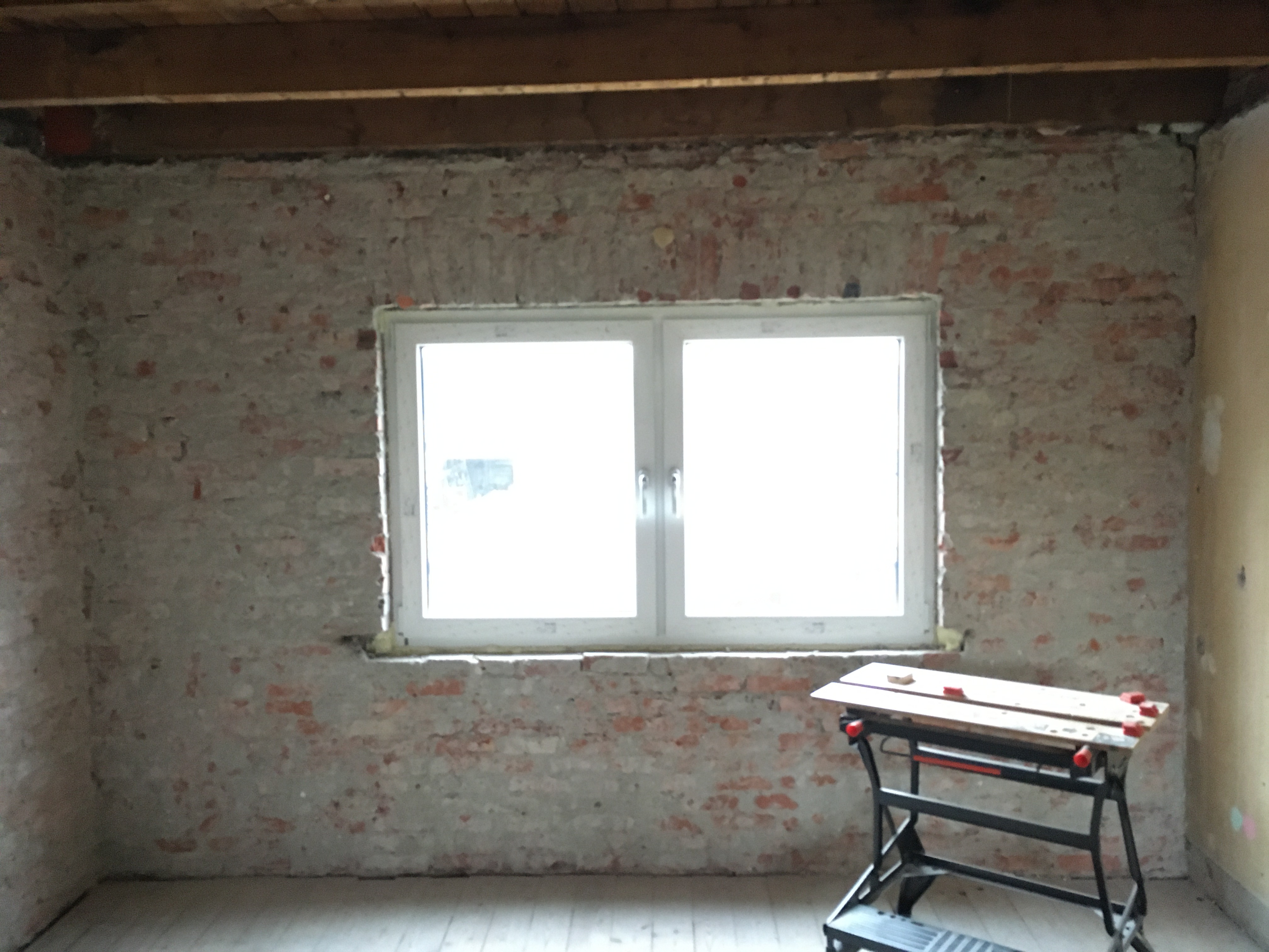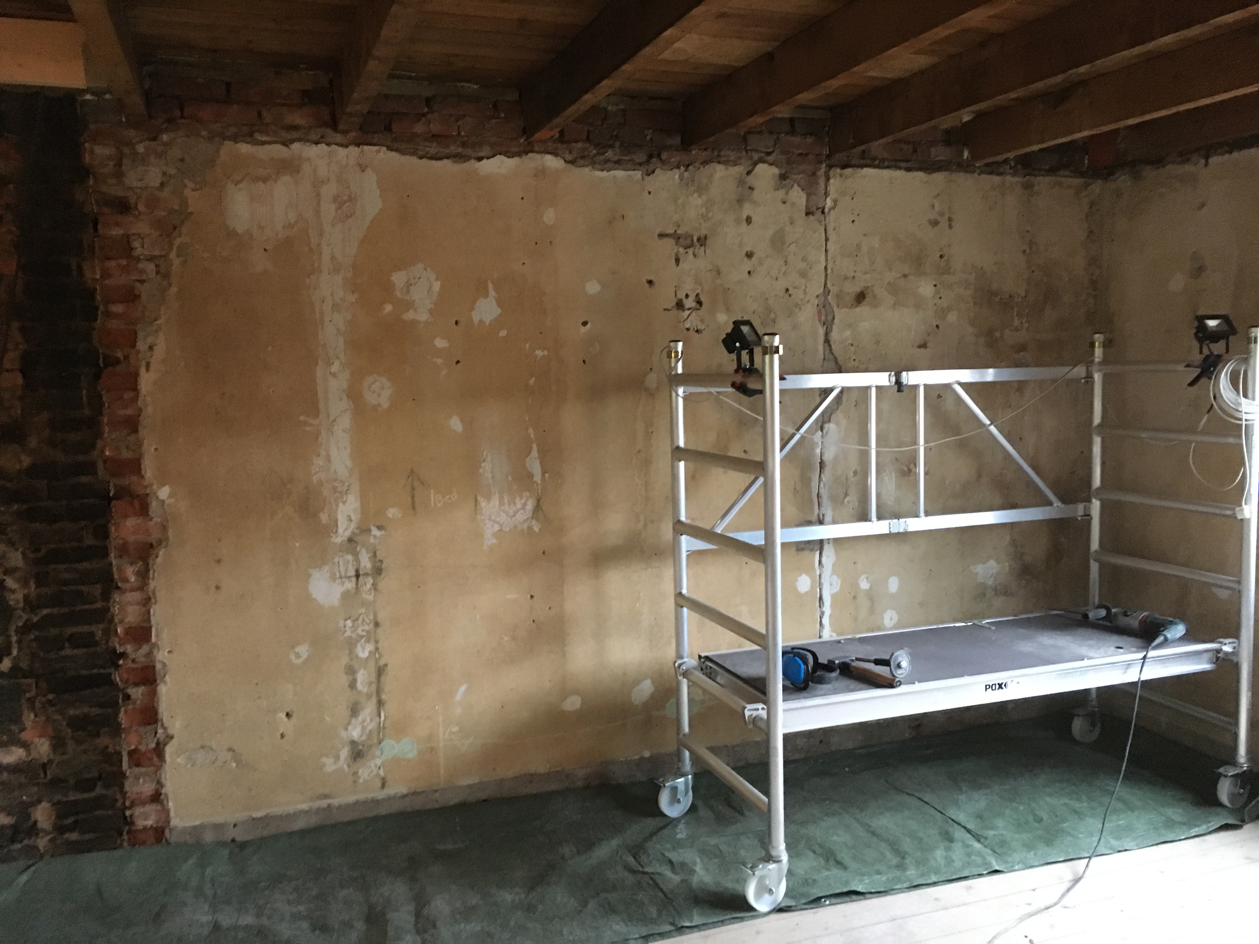 Het stuc op de buitenmuren zit op veel plekken niet meer heel erg vast. Aangezien we ook nog flink willen bij-isoleren op deze muren hebben we besloten het er dan maar van af te halen en zo een beetje ruimte te winnen.