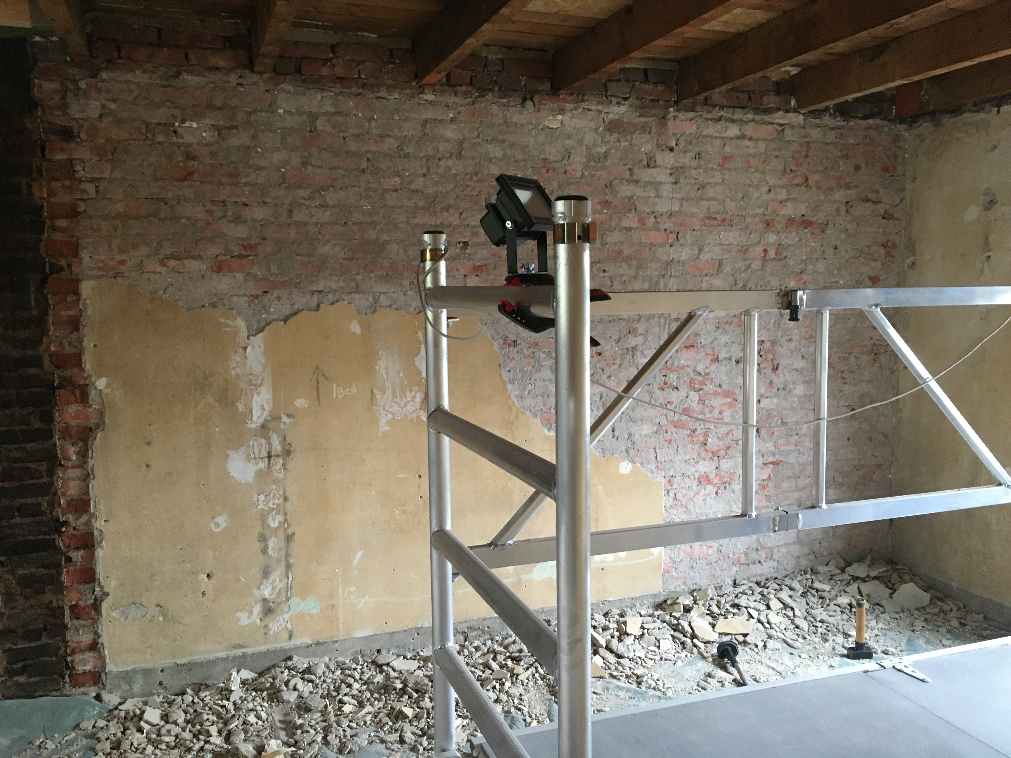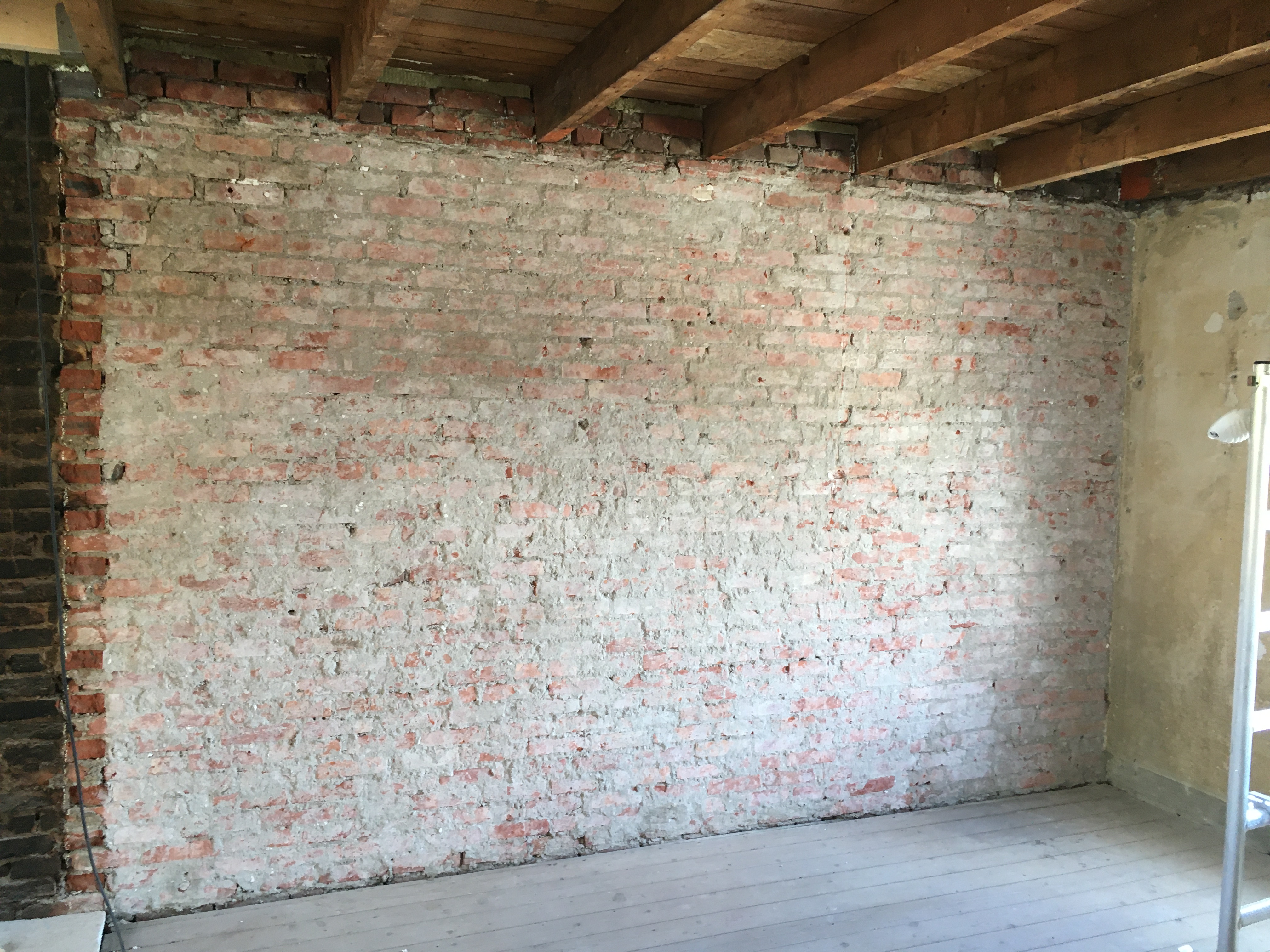 Sommige stukken zaten inderdaad heel erg los, op andere plekken was het soms nog flink bikken om het eraf te krijgen, maar het is klaar! Nu kunnen we stroombuizen op de muur aanleggen zonder dat we bang hoeven te zijn dat de stuc eraf komt vallen.