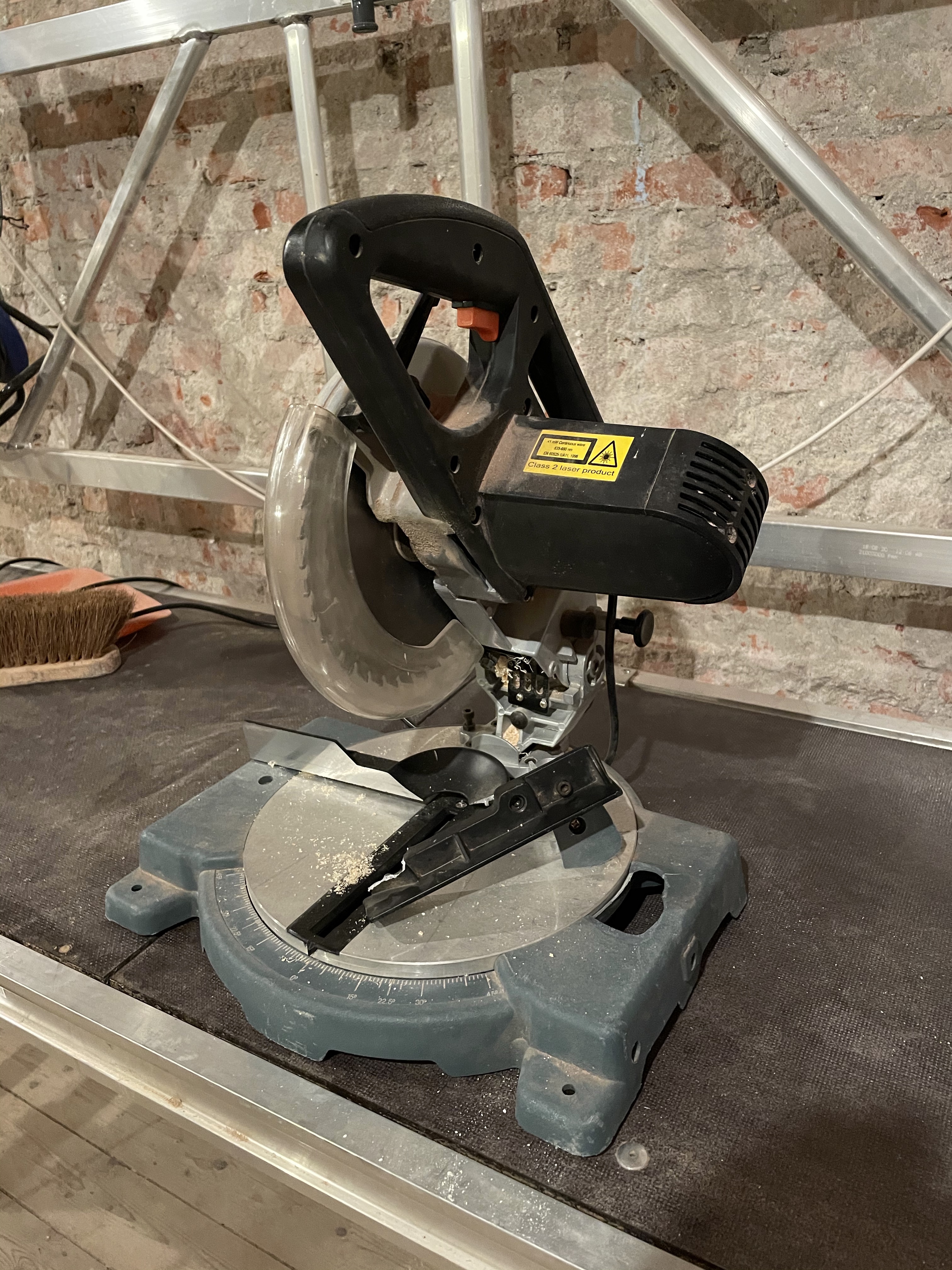 De afkortzaag die ik jaren geleden ooit eens derdehands gekregen heb is deze week overleden. De afstelling was al wat lastig, alle accessoires en dopjes misten, de geleiderail was krom en ga zo maar door, maar deze week kwam de genadeklap. Het blad greep een noest vast en ramde de geleiderail in tweeën.