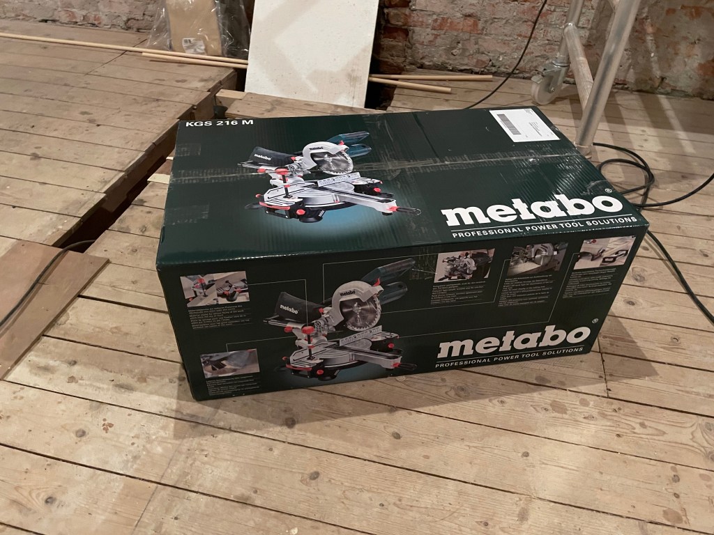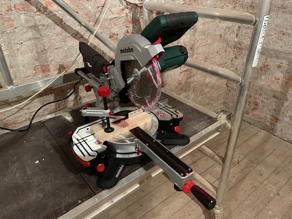 De nieuwe afkortzaag is een telescopische (het zaagblad kan behalve naar beneden ook naar voren/achteren getrokken worden), is goed instelbaar in verstek op 2 assen en voorzien van allerlei methodes om het werkstuk vast te zetten. Ook handig zijn de lamp en het laserlijntje om precies te zien waar je gaat zagen.