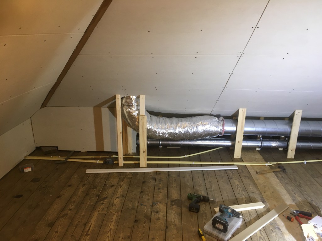 Tot de ventilator en de verdeelbox geplaatst zijn, zullen we de ruimte rond de eindes van de buizen nog even vrij moeten houden. Desondanks is de rest nu volledig beplaat!
