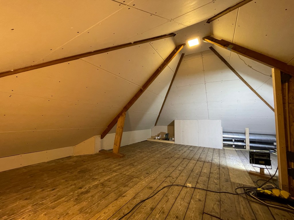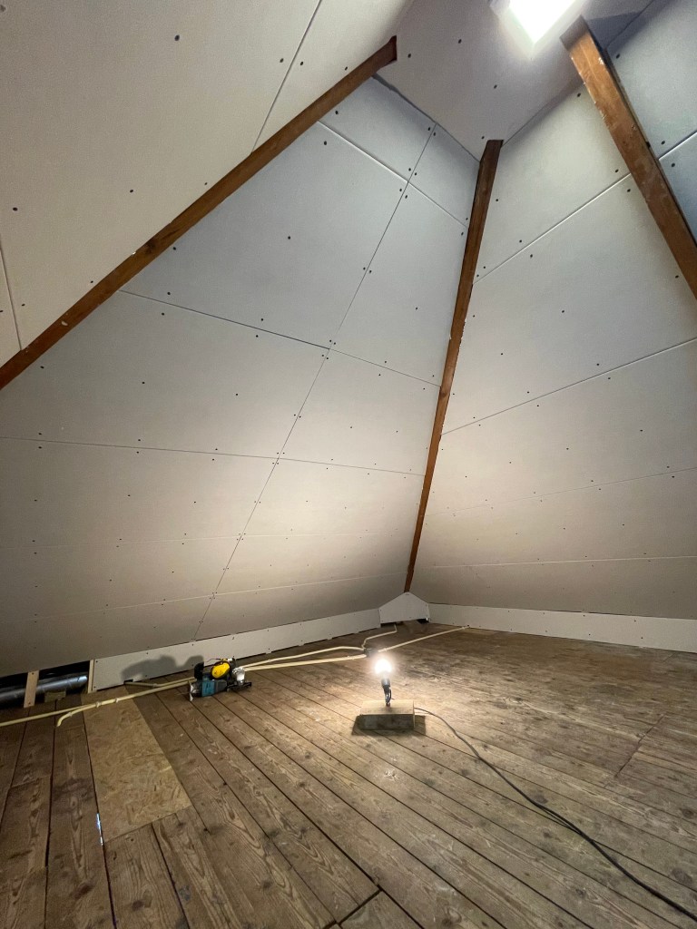 We begonnen met de ontbrekende gipsplaten op de schuine wand. Toen die hingen gingen we verder met de knieschotten.