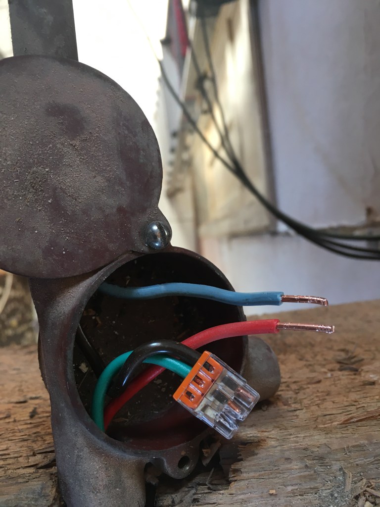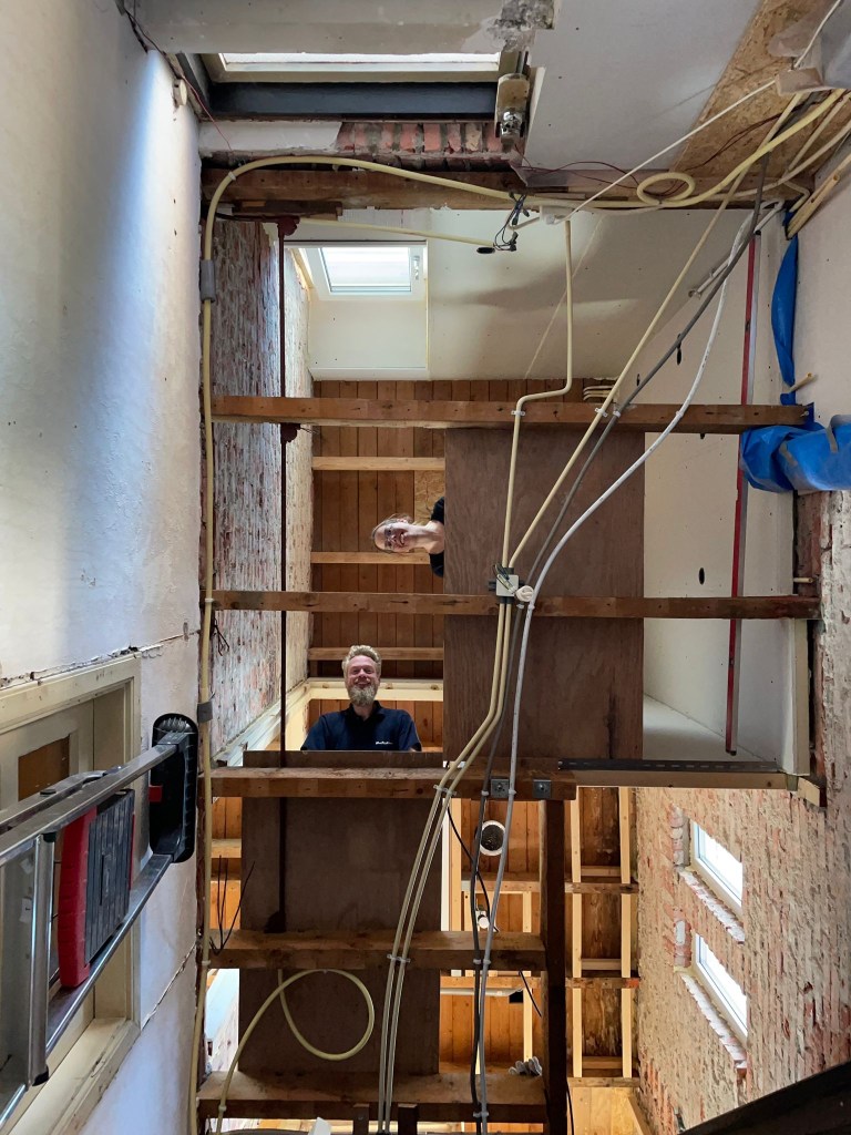Omdat de oude (rode) elektriciteitsleidingen aan de bovenkant van de balken aangelegd zijn is het makkelijker om deze te verwijderen wanneer de vloer er af is. Deze ijzeren leidingen zijn sowieso niet meer van deze tijd, maar de draden laten we nog even in takt zo lang we nog beneden wonen en daar graag stroom willen hebben.