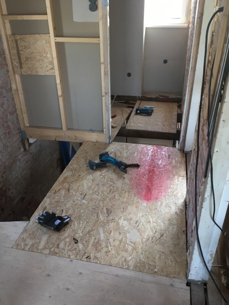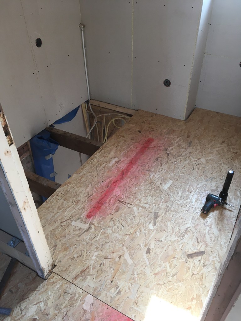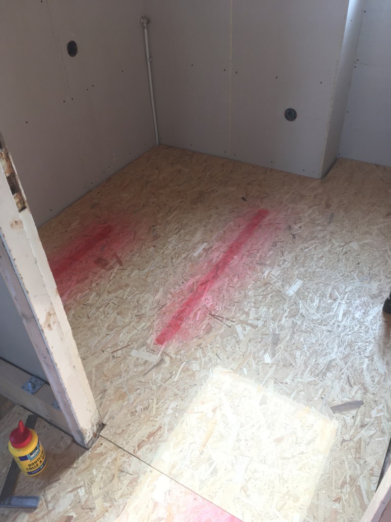 De gang konden we uit 1 groot stuk OSB maken. Ook deze zit met een ‘tong in groef’ verbinding gelijmd, en sluit mooi aan op de underlaymentplaten van de badkamer.