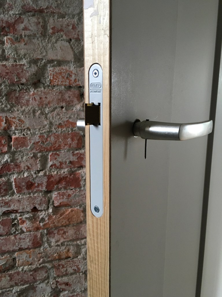 Hiermee op de andere kant van de deurpost de uitsparing voor de schoot gemaakt en de sluitplaat gemonteerd.