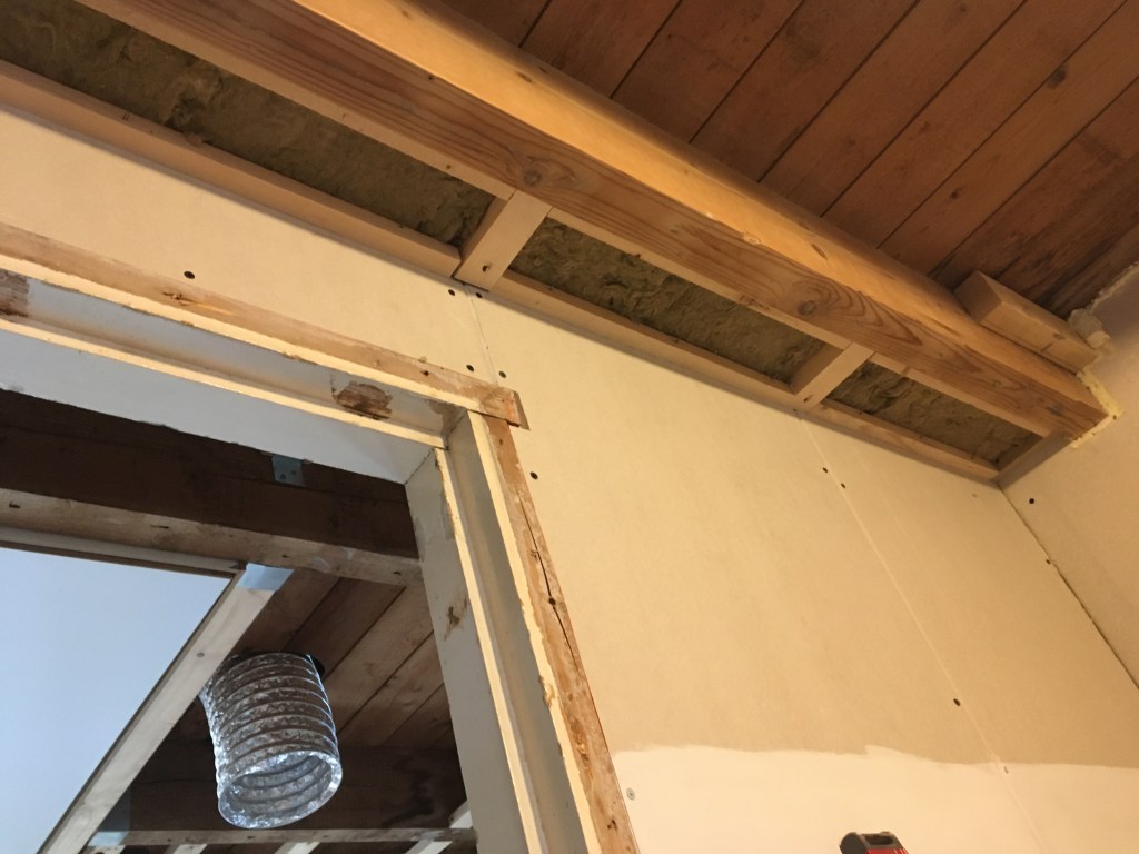 Omdat we de boel een beetje stofvrij willen houden is het essentieel om een deur te monteren en de laatste kieren te dichten. Als eerste heb ik een frame gemaakt bij de muur naar de gang en dit vol met steenwol gestopt. Dit is zwaar en geeft daardoor goede geluidsisolatie.