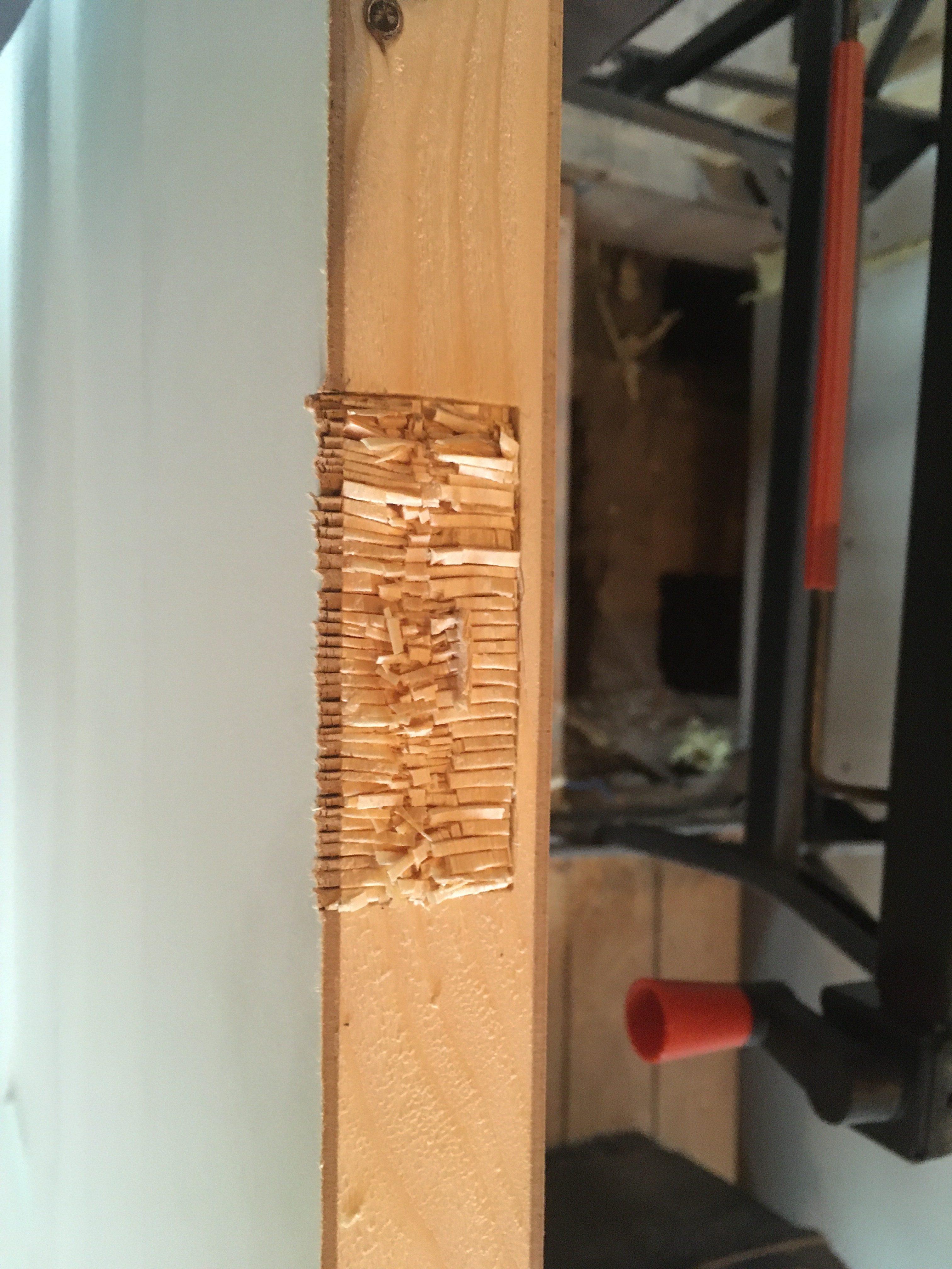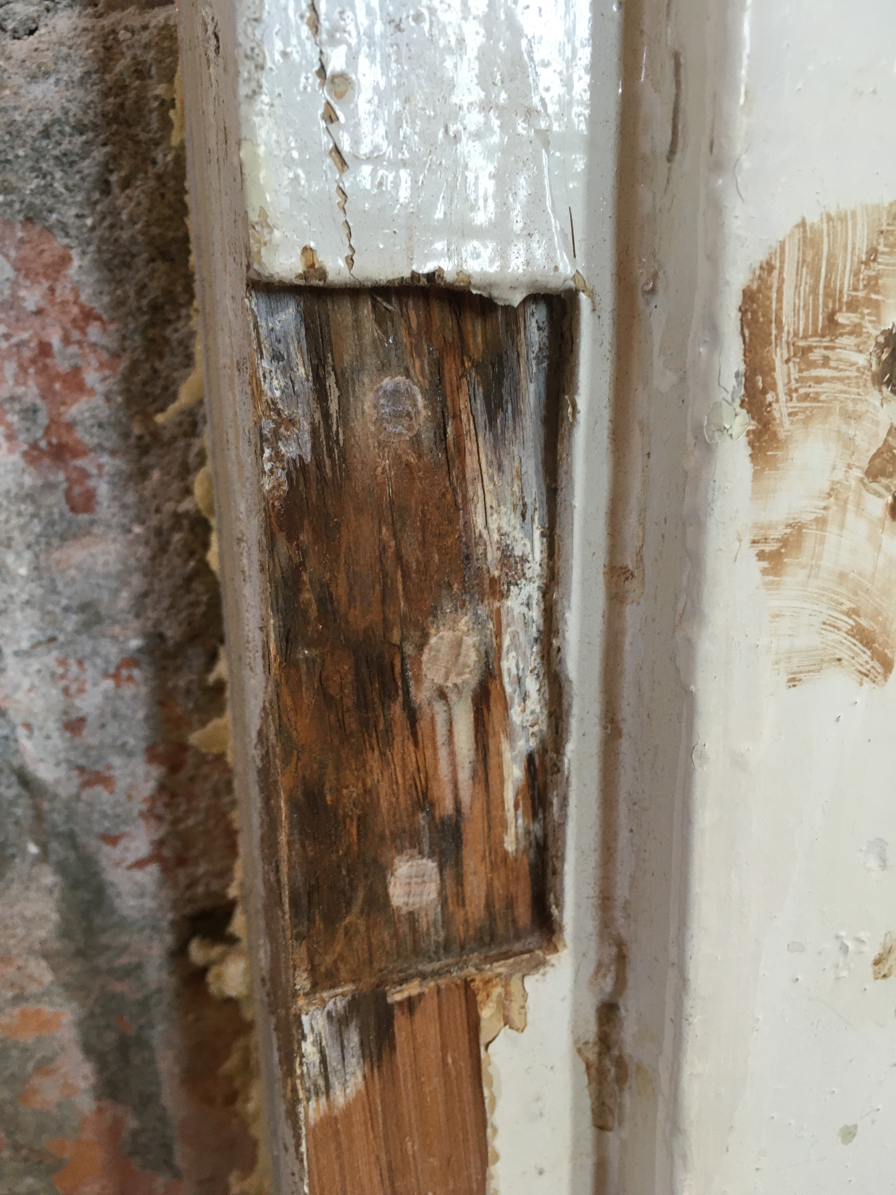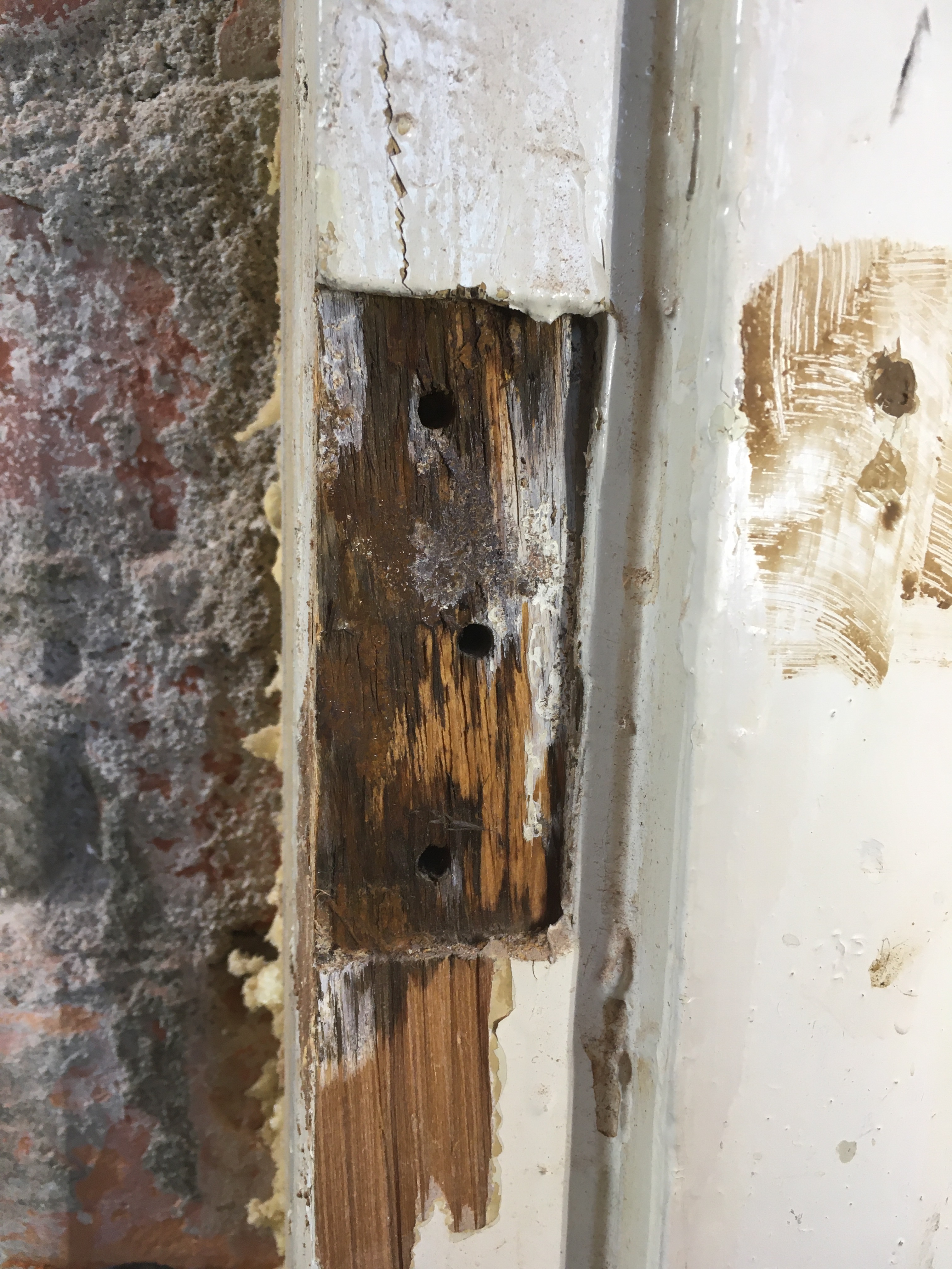 Als eerste de deur dus aan alle kanten bijgeschaafd om deze passend te maken. Daarna de plekken waar de scharnieren zaten op de deurpost aangepakt. Deze zijn wonderwel exact het goede formaat van de nieuwe scharnieren, alleen zitten de schroefgaten op de verkeerde plek en zijn flink uitgelubberd. Hier kun je geen deur aan ophangen.
