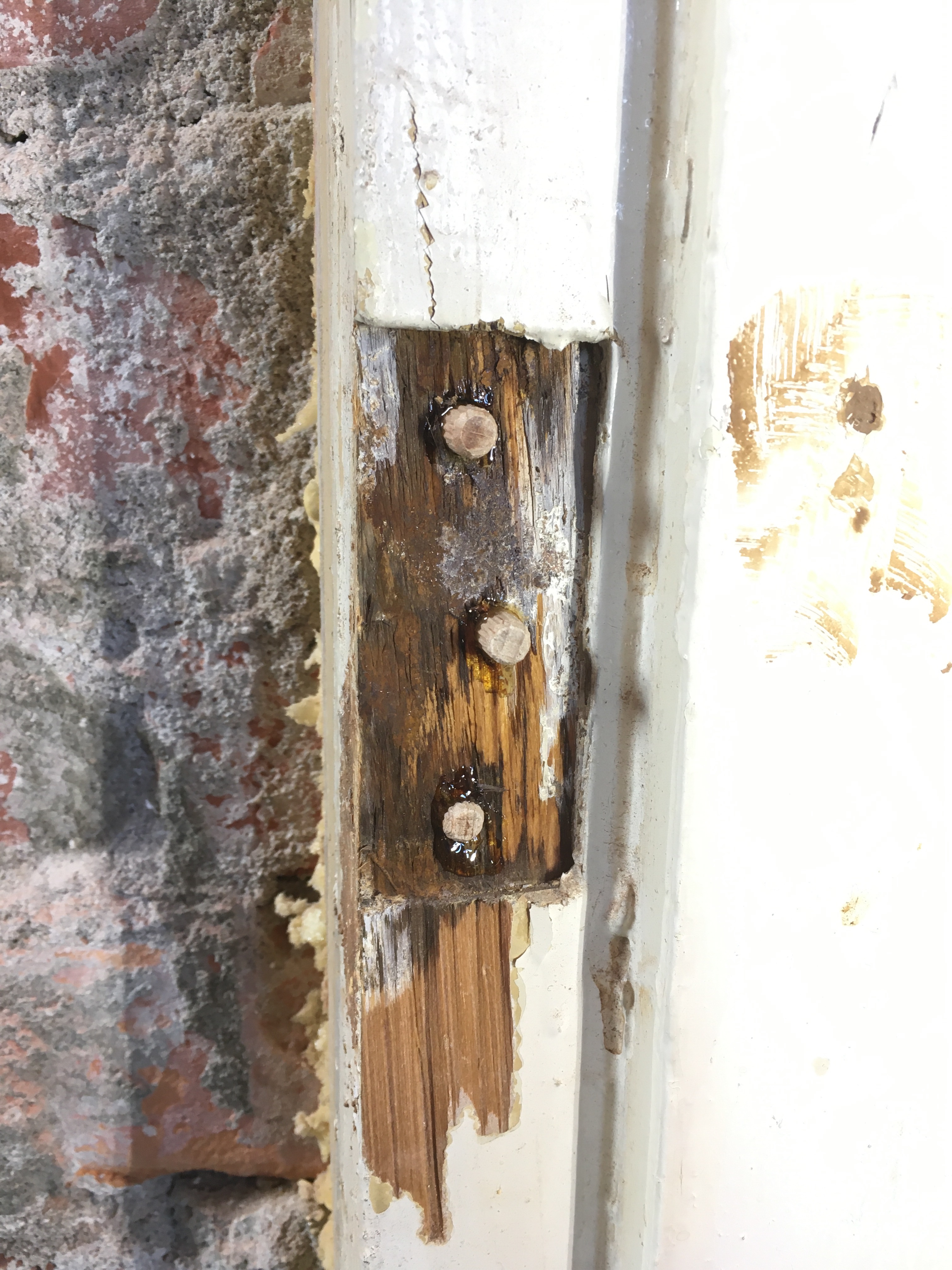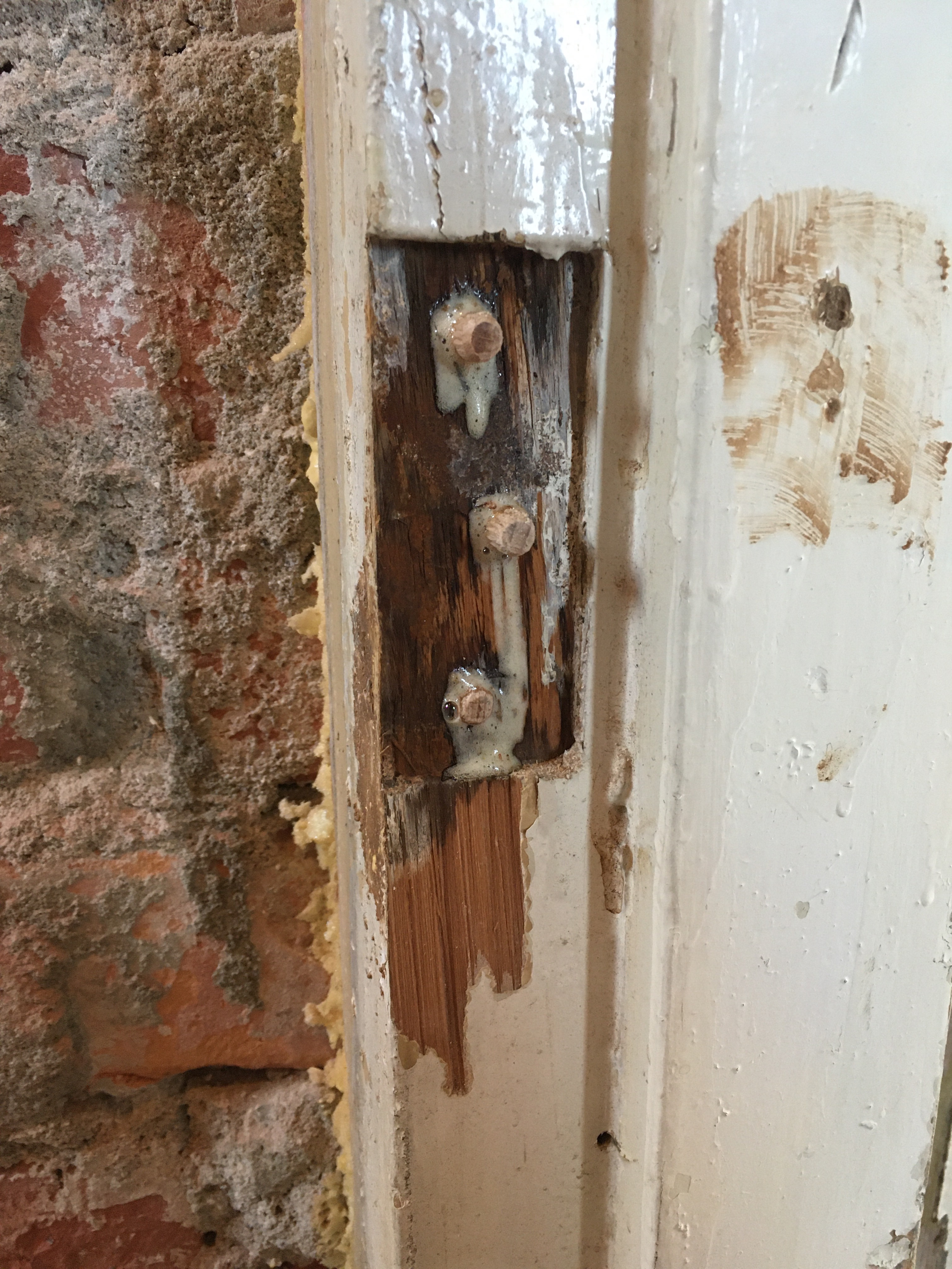 Om dit weer stevig te maken heb ik de schroefgaten opgeboord tot 6 millimeter en hier evengrote houten pluggen met zeer sterke constructielijm in gelijmd. Zodra de lijm droog was de pluggen vlak met de deurpost afgezaagd om zo weer een ‘massief’ houten ondergrond te hebben. Hier heb ik vervolgens het nieuwe scharnier op vastgeschroefd.