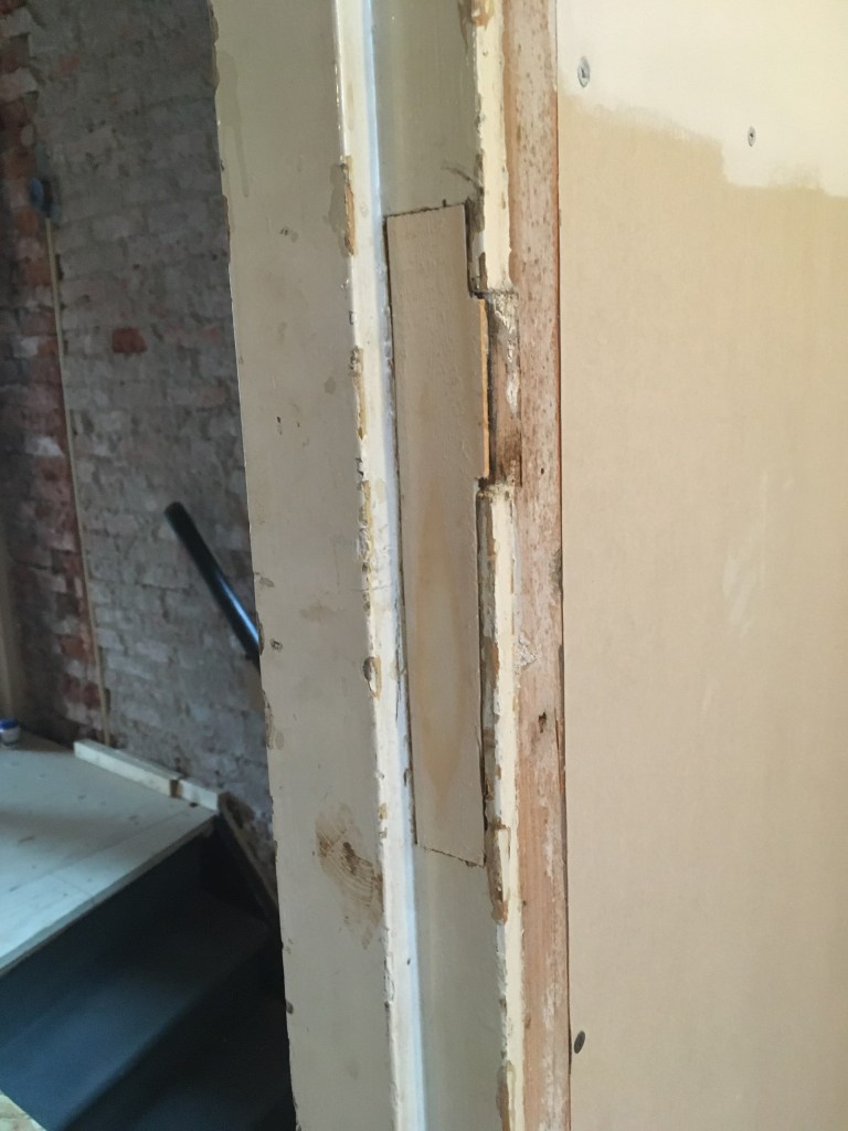 De originele deuren hebben we niet meer, dus we hebben voor de bovenverdieping nieuwe paneeldeuren gekocht in de stijl van het huis. De deurposten zaten er nog wel allemaal in maar zijn hevig beschadigd en krom.
