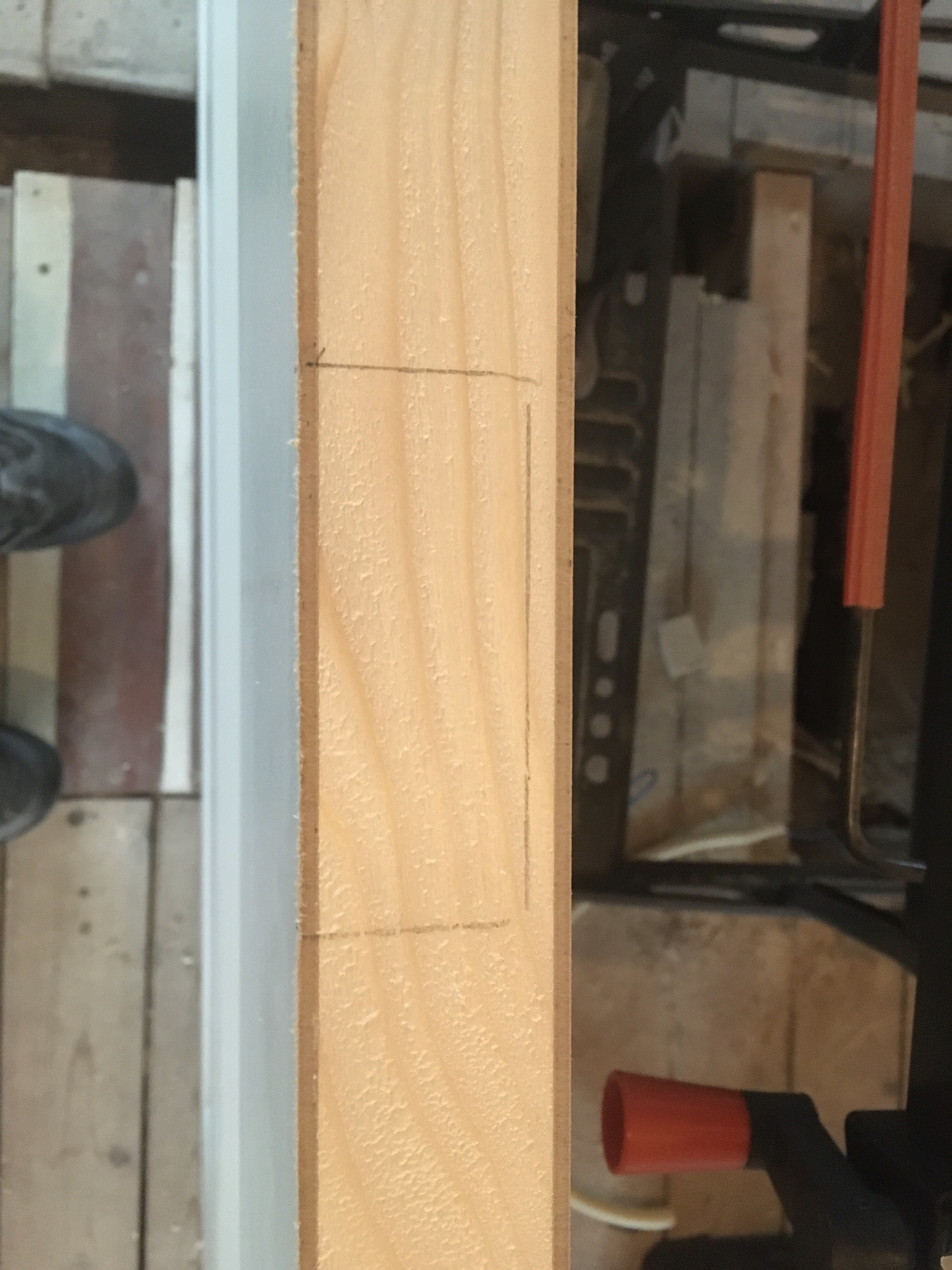 Omdat de deuren nieuw zijn zitten hier nog geen uitsparingen voor de scharnieren in. Na deze afgetekend te hebben heb ik de omtrek ingebeiteld waarna ik de uitsparing van het scharnier verder met de beitel kon maken. Zodra de uitsparing op maat en netjes was kon hier het andere deel van het scharnier ingeschroefd worden.