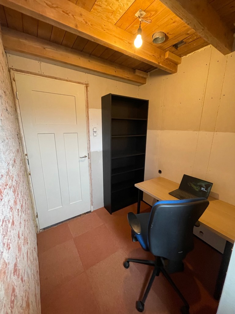 Met wat oude tapijttegels die van Corine en Max gekregen hebben, een Ikea Billy van 10 euro op marktplaats en wat meubeltjes van één van de werkplekken beneden presenteer ik u: ons kantoor!