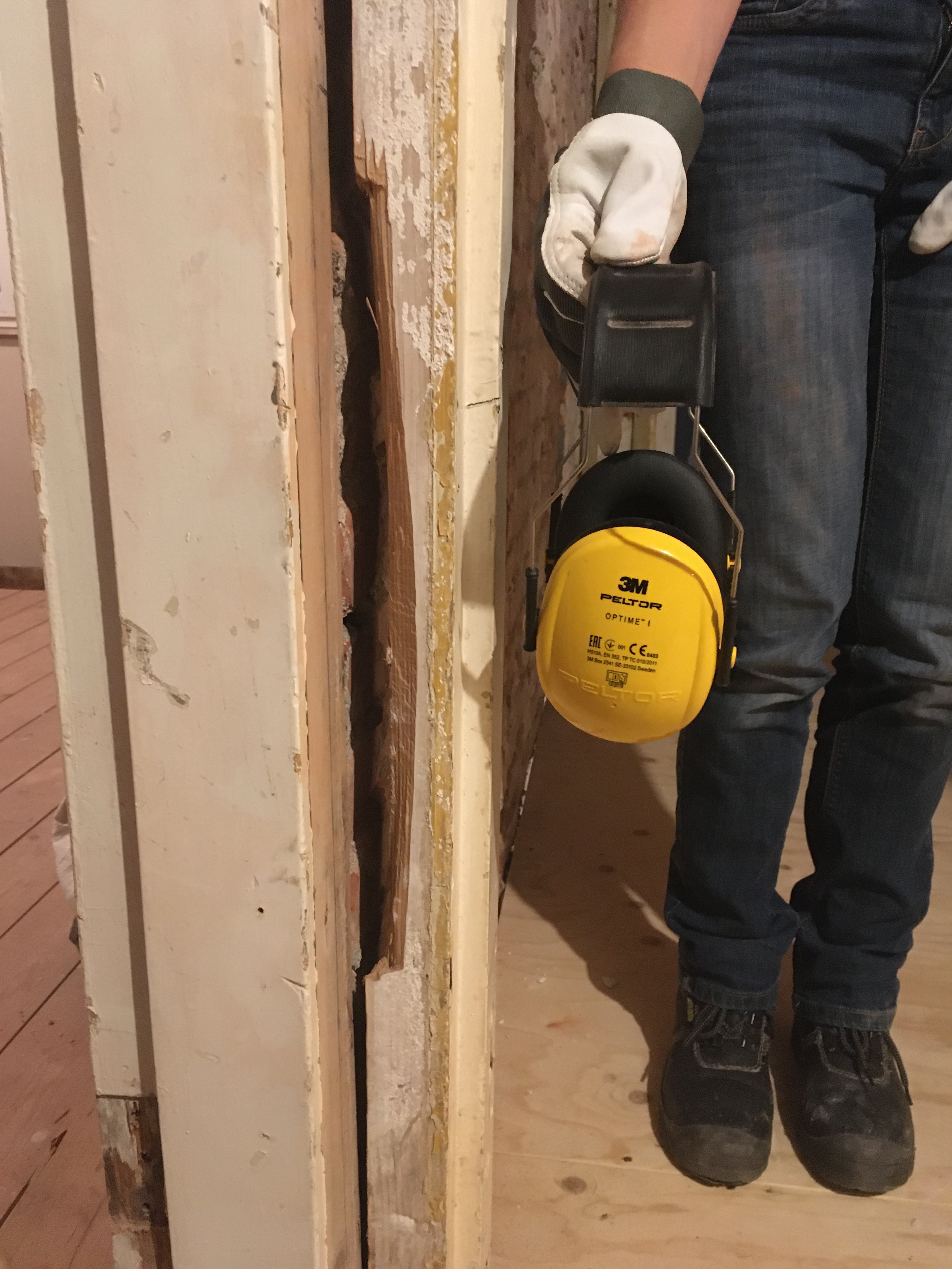De volgende stap is de muur tussen de badkamer en de gang plaatsen. Het deurkozijn had een flinke beschadiging dus deze had een reparatie nodig.