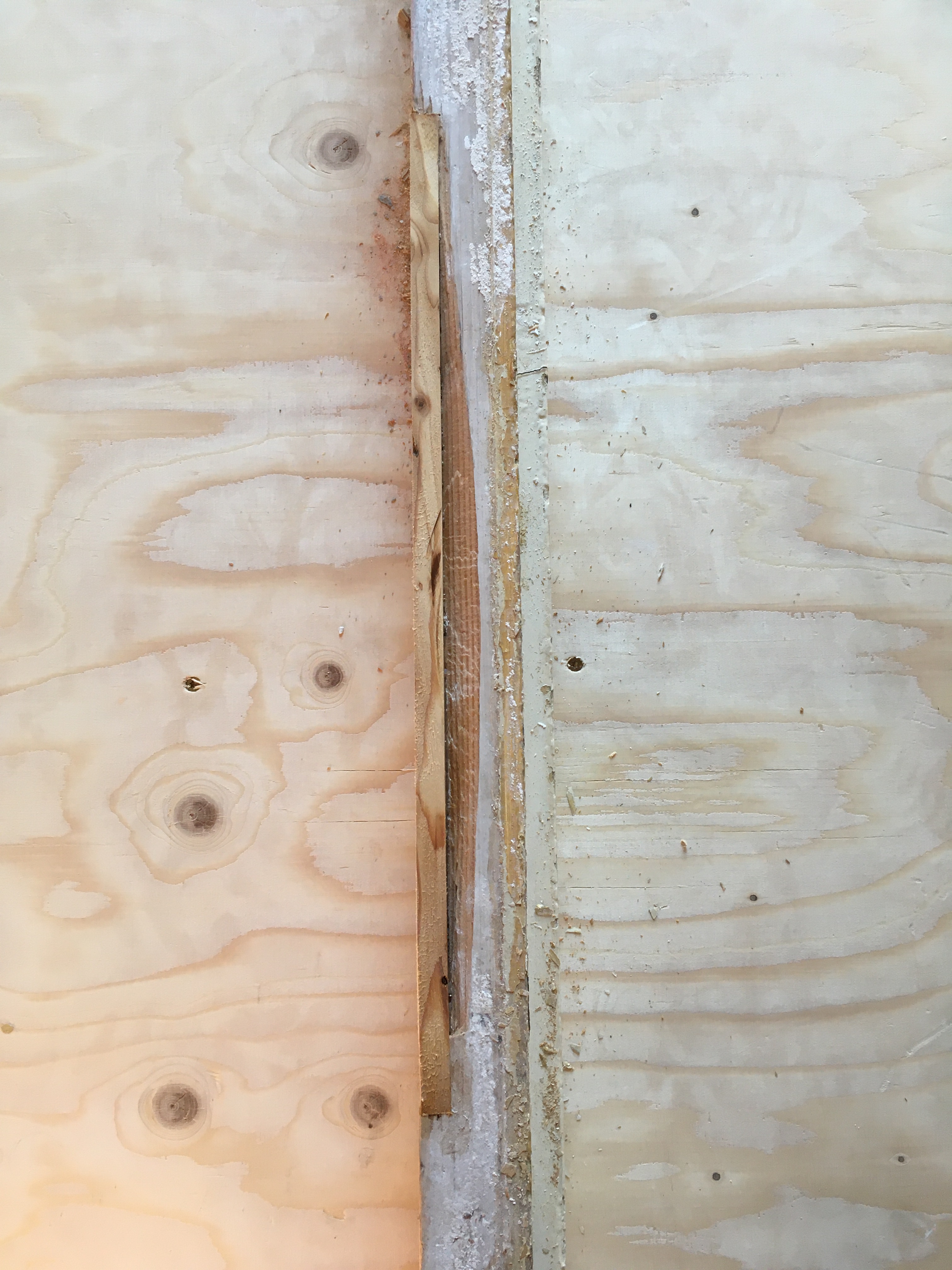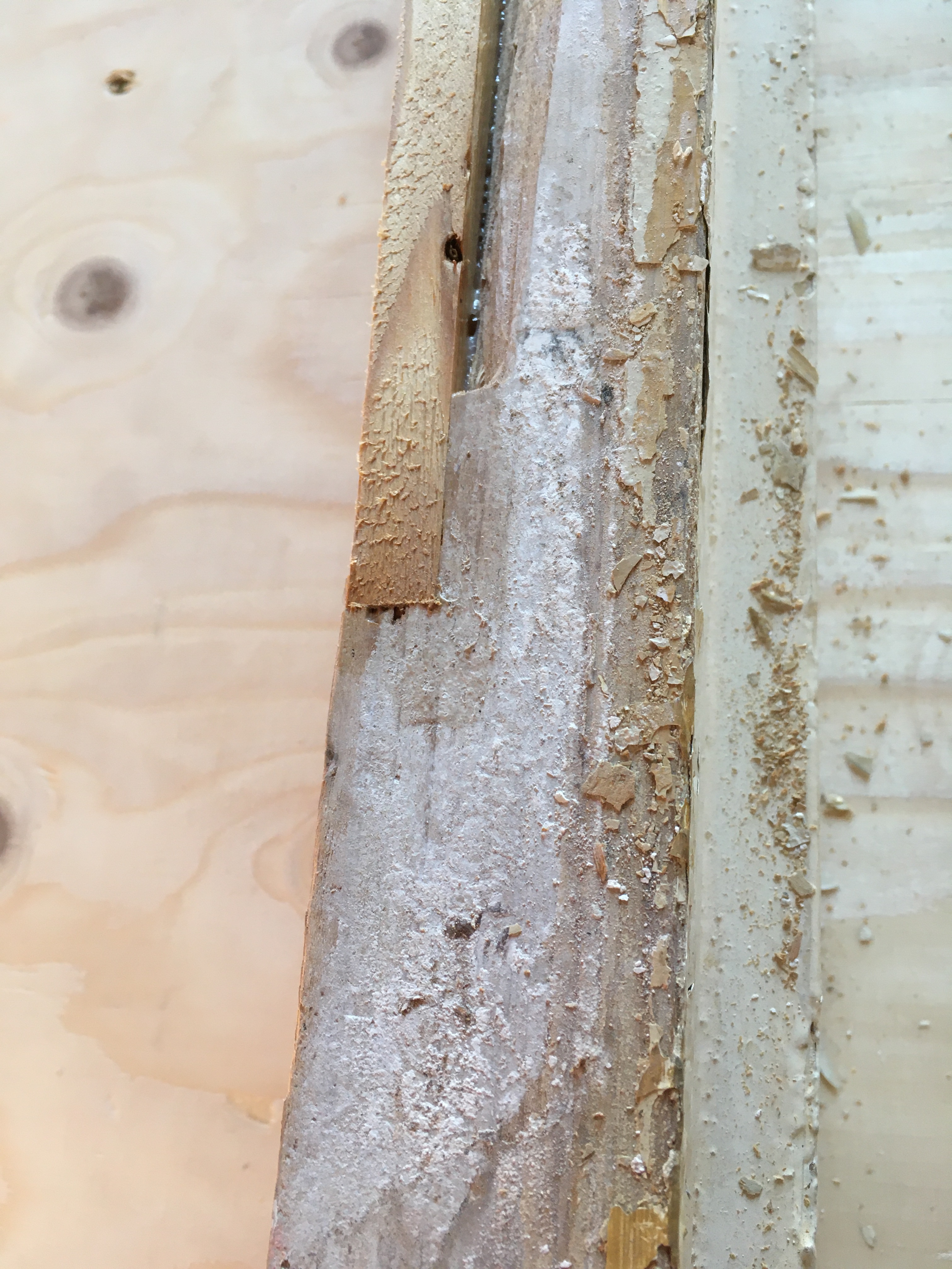 Het grootste deel van de beschadiging heb ik uitgezaaid en opgevuld met een vers stuk hout. De groef die nog over blijft is klein genoeg om bij het schilderen met houtvuller glad te kunnen maken.