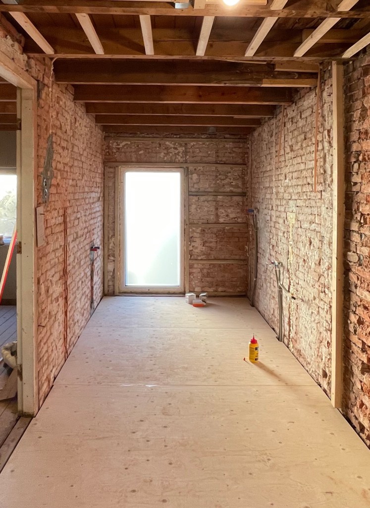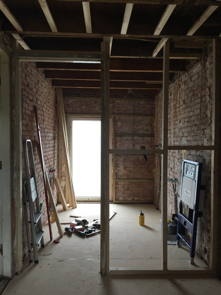Rest ons nog om de stroom aan te leggen, de voorkant van het toilet dicht te maken en überhaupt een (tijdelijke) badkamer te maken voor de tijd dat we (tijdelijk) boven gaan wonen.