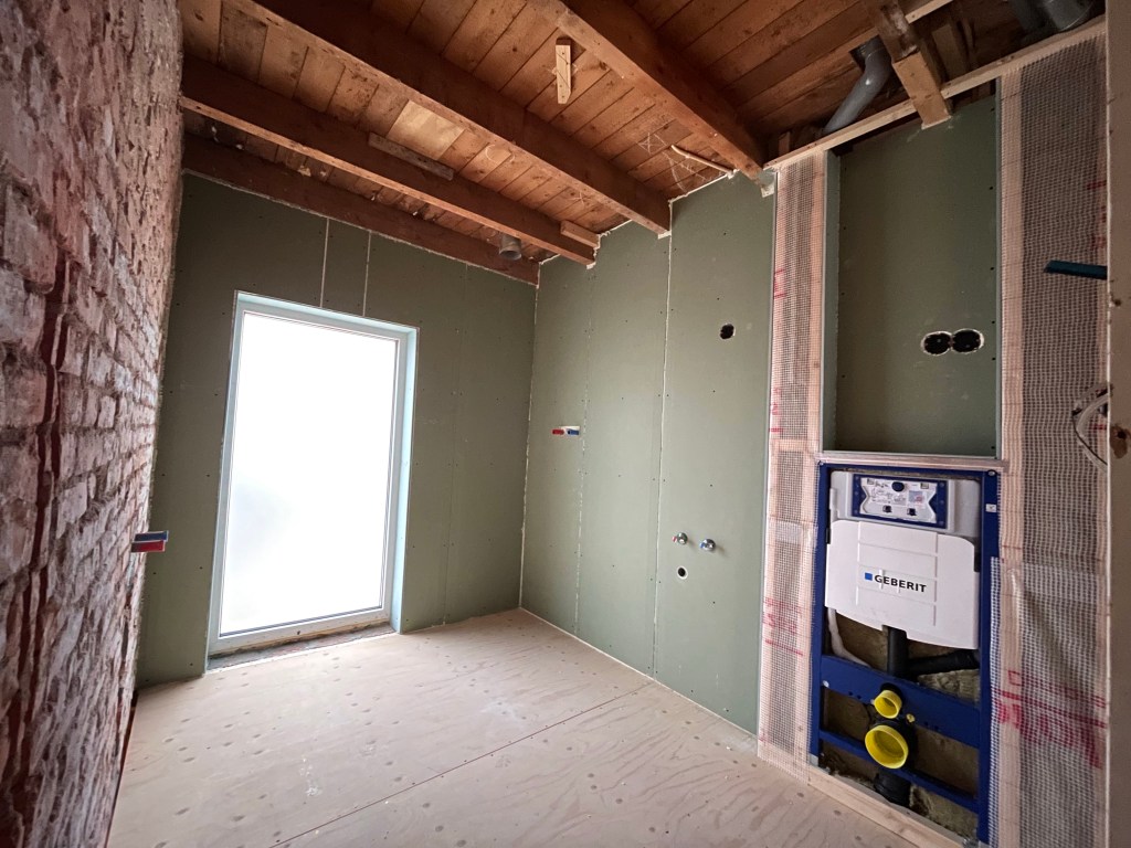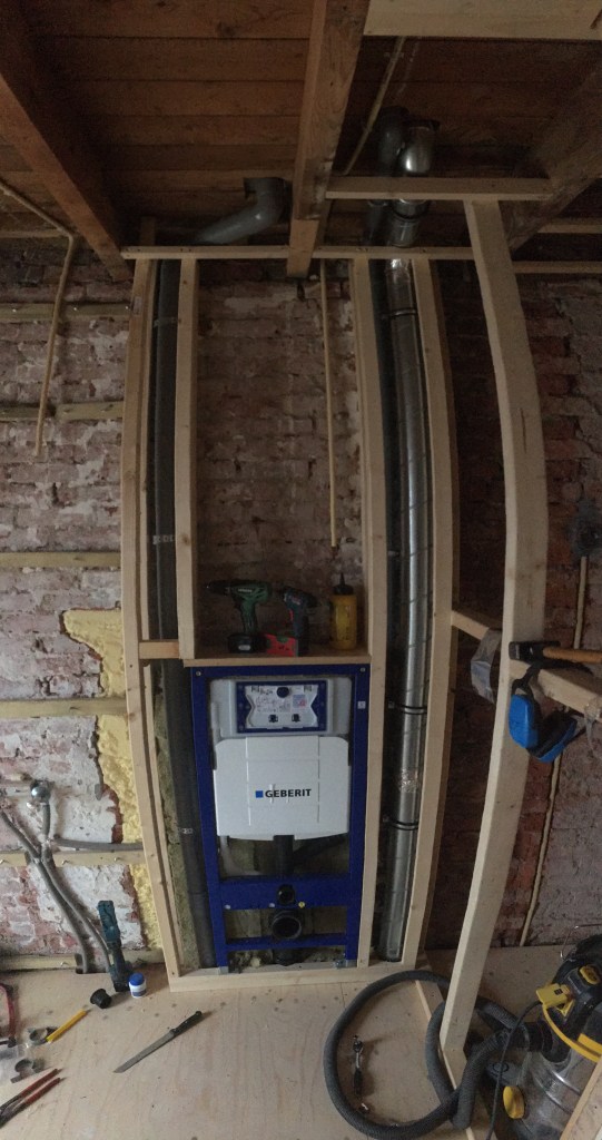 Omdat het frame van het (hangende) toilet in de muur bevestigd wordt moet dit eerst geplaatst worden. Ook moeten er drie leidingen van zolder naar beneden, welke we in twee koven wegwerken. De ruimte tussen de koven zetten we uiteindelijk plankjes in voor een open bergruimte.