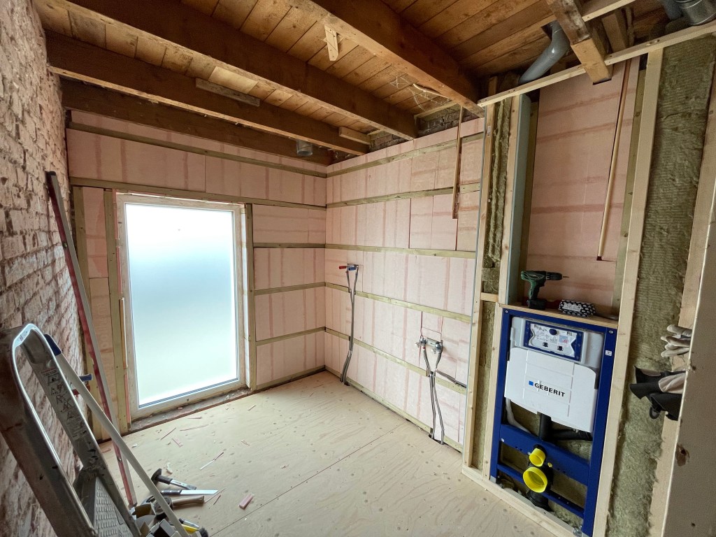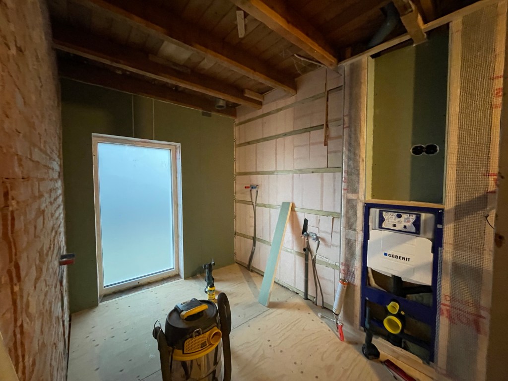 Behalve de platen links op de foto is hier ook een dampwering op de steenwol aangebracht én hebben we last minute de afvoer voor de wastafel in de muur aangelegd (de donkere buis onder de losstaande gipsplaat). Iets wat we absoluut niet bijna vergeten waren 😇