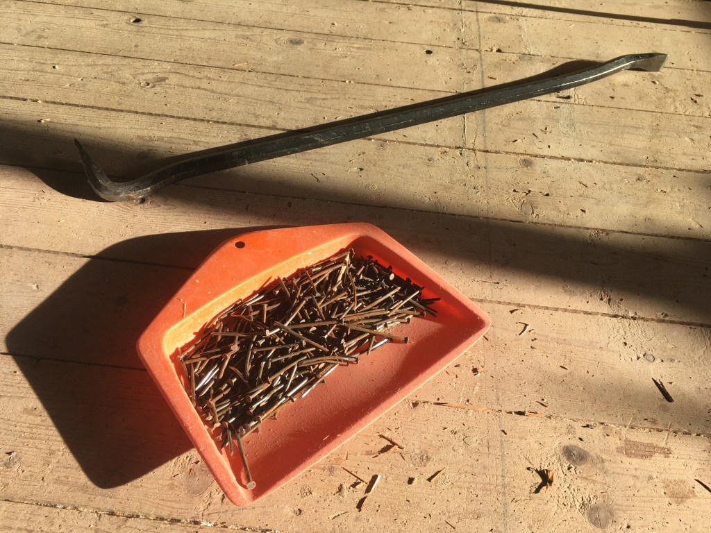 We hebben zoveel als mogelijk de planken in hun geheel er uit geprobeerd te halen om ze te kunnen hergebruiken bij een ander toekomstig project. Dat is deels gelukt; ongeveer de helft kwam er goed uit, de andere helft is klein gezaagd voor brandhout, wachtend op zwoele zomeravonden en een achtertuin vol mensen…