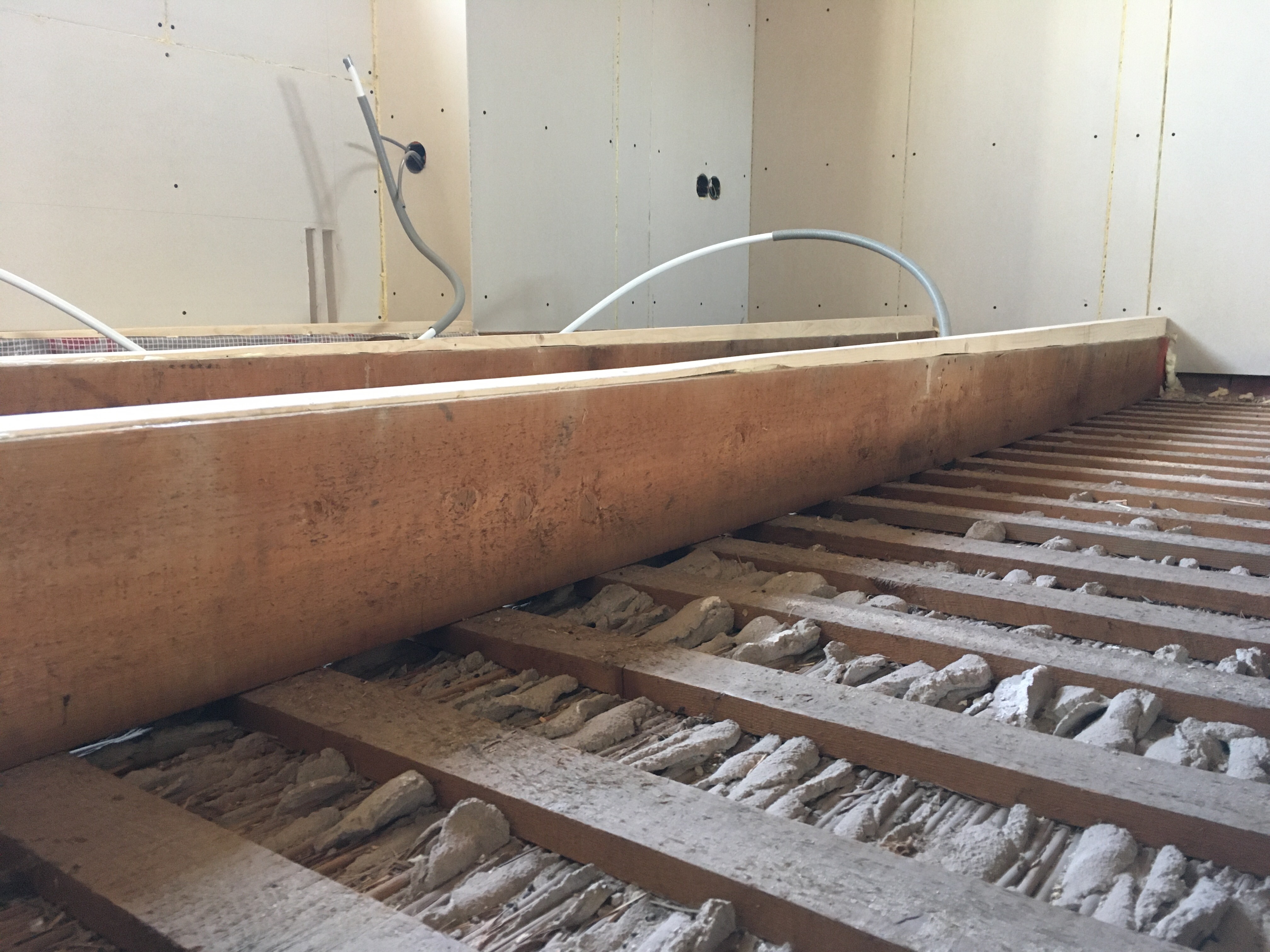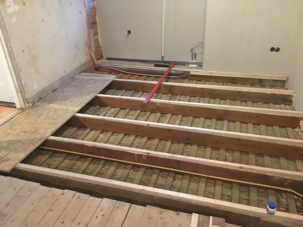 Voor elke bestaande balk hebben we een kleinere, nieuwe (en rechte) balk gekocht welke we waterpas naast de bestaande balk te houden. Vervolgens de curve van de bestaande balk afgetekend op de nieuwe balk en deze volgens de lijn afgezaagd. Zo ontstaat er een grote wig die precies op de oude balk past. Deze vervolgens met lijm en schroeven op de balk geplakt, wat resulteert in een recht oppervlak om de nieuwe vloer op te kunnen schroeven.