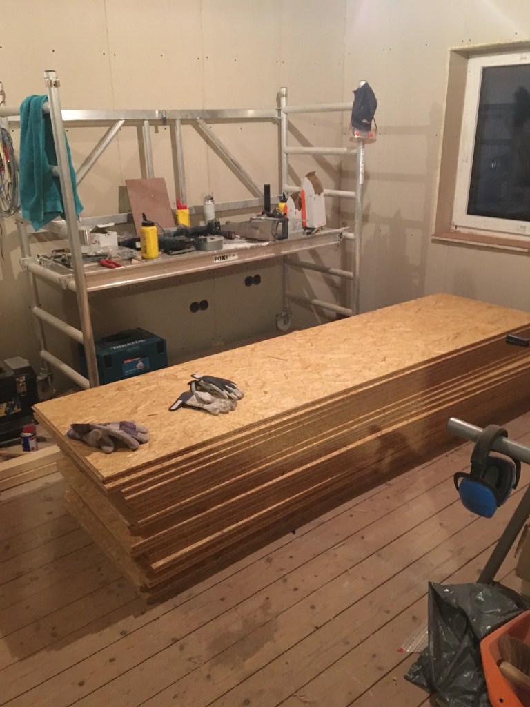 Na wat speurwerk weer een partij B-keuze bouwhout weten te vinden die nog enigszins betaalbaar was. De LidiAanhangwagen konden we bij de winkel vanaf de palletwagen volladen, maar thuis heb ik samen met buurman Maarten de zware platen stuk voor stuk de trap op mogen tillen. Deze stapel is gelukkig genoeg voor beide slaapkamers.