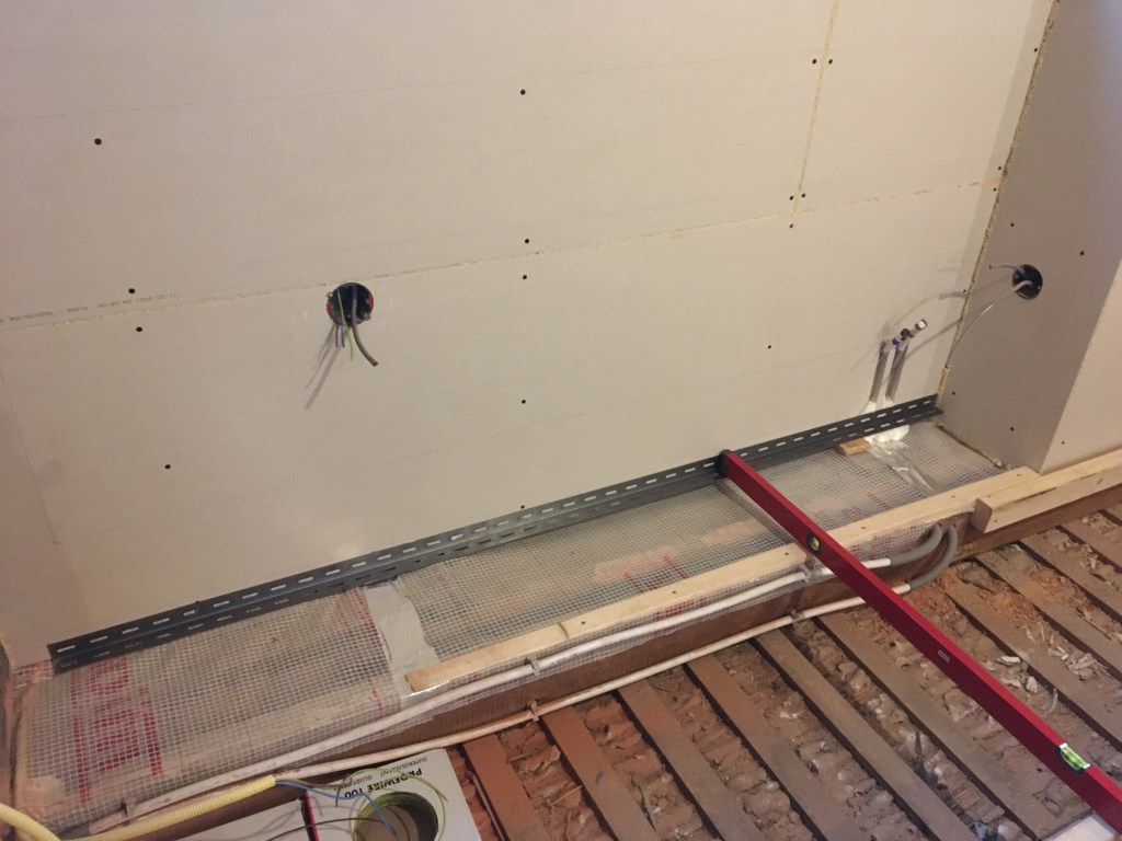 Je ziet hier ook goed hoe de nieuwe verwarmingsleidingen onzichtbaar door de vloer en de muur naar de plek van de radiator lopen.