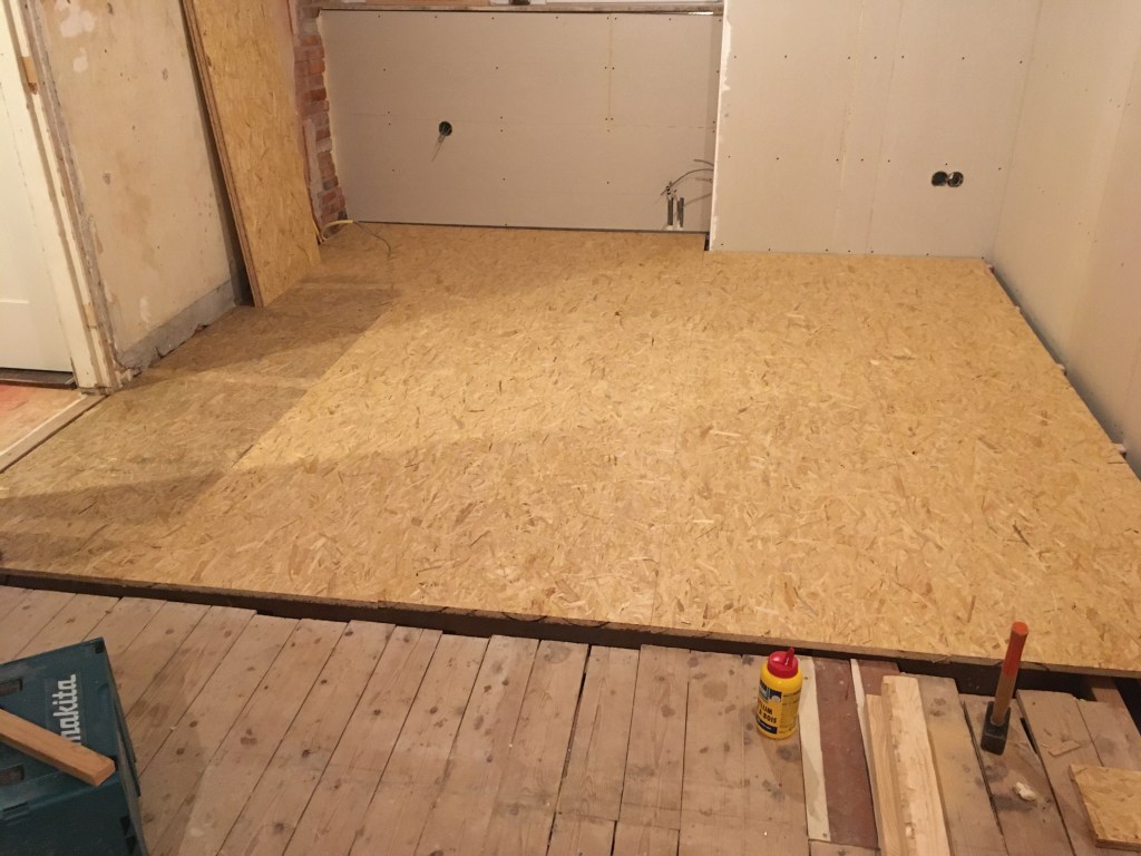 En dan is het een kwestie van platen monteren. Ook deze platen zijn voorzien van mes-en-groef. Door deze messen en groeven rijkelijk voorzien van houtlijm goed in elkaar te drukken vormt het één stevige, en tevens waterpas vloer.