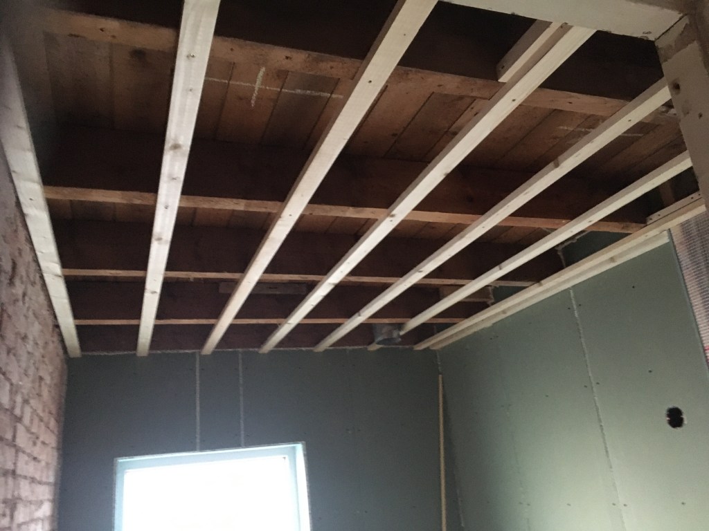 Daarna is het plafond aan de beurt. Om de gipsplaten te bevestigen eerst rachels aan de balken gemaakt.