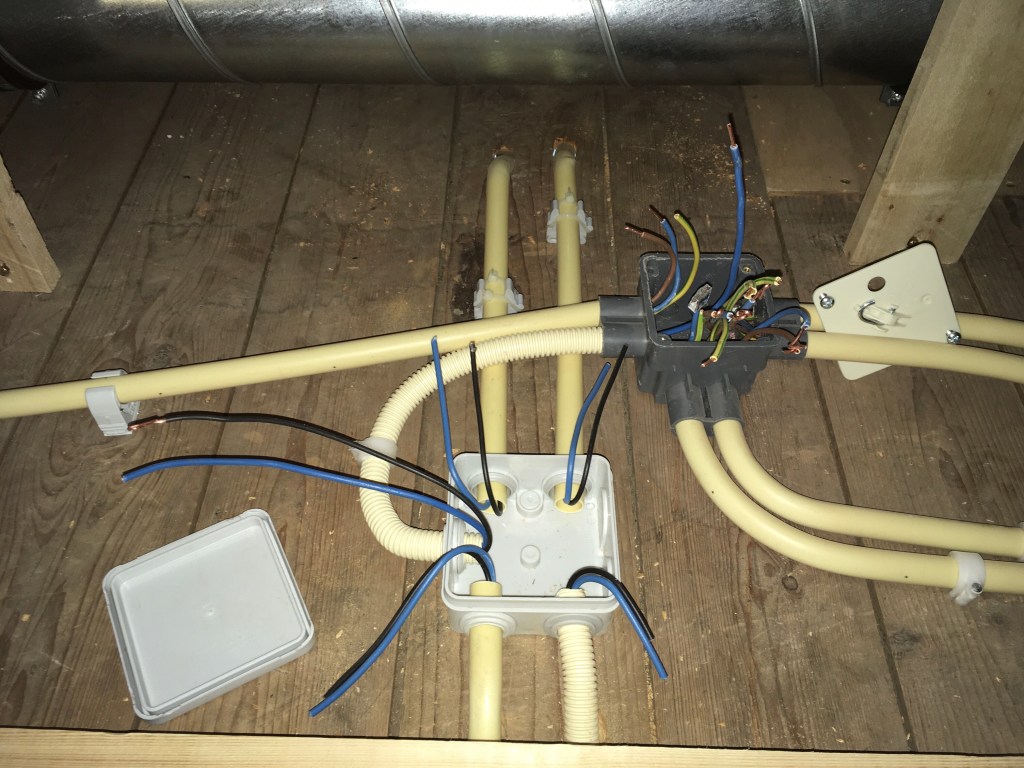 De buitenmuren van de badkamer zijn gedaan, maar het plafond moet nog dicht. In dat plafond moet natuurlijk nog verlichting, dus eerst de stroom maar eens in orde maken.