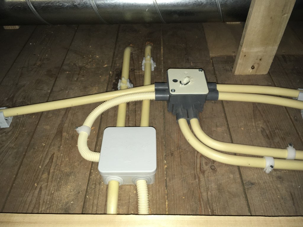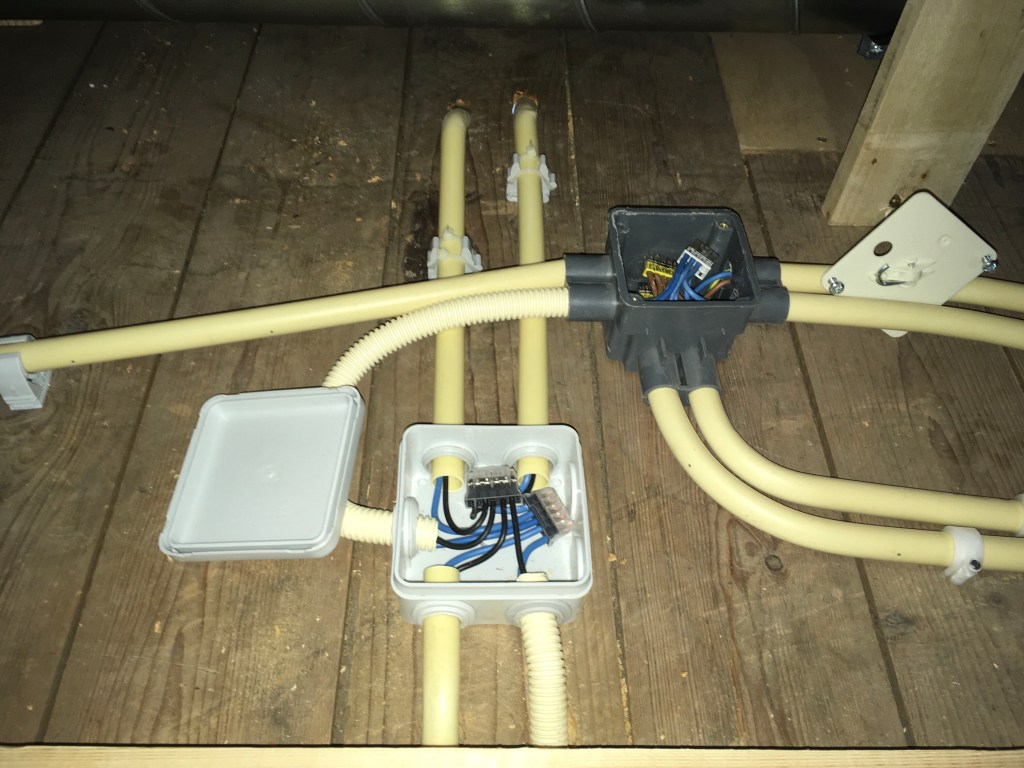 Er komen vier spotjes (of LED-panelen om precies te zijn), dus om die stroom te geven is er naast de centraaldoos (op zolder) een aparte lasdoos gemaakt waar de vier buizen voor de stroomdraden van de spots samen komen. En dan alle draden trekken!