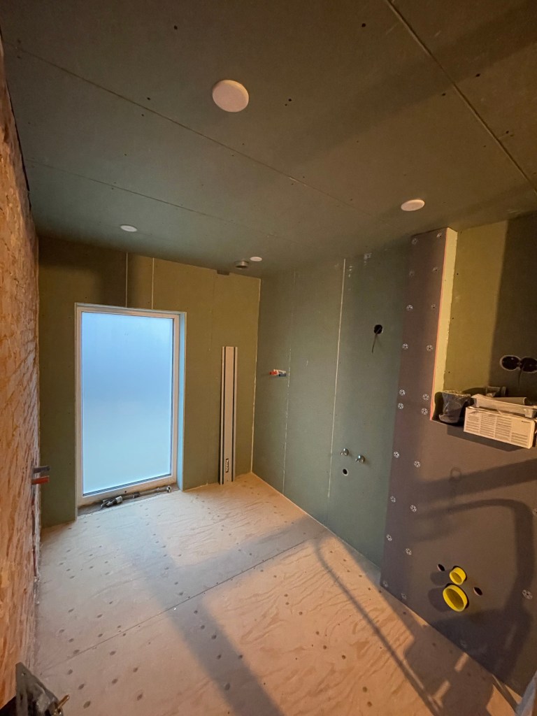En daarna de gipsplaten van het plafond en de platen voor het reservoir van het toilet bevestigd. De platen bij het toilet zijn zogenaamd Q-board dat speciaal gemaakt is om te isoleren, stevig genoeg is om een toilet tegenaan te kunnen schroeven én direct te betegelend zijn. Dat leidt tot het volgende resultaat:
