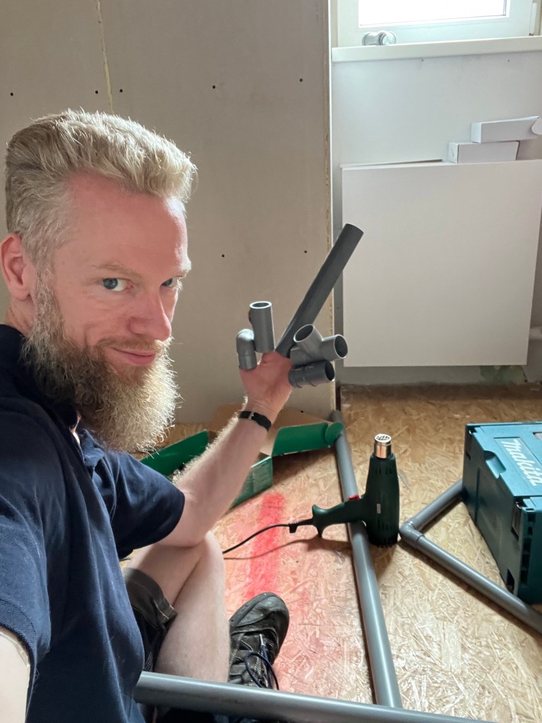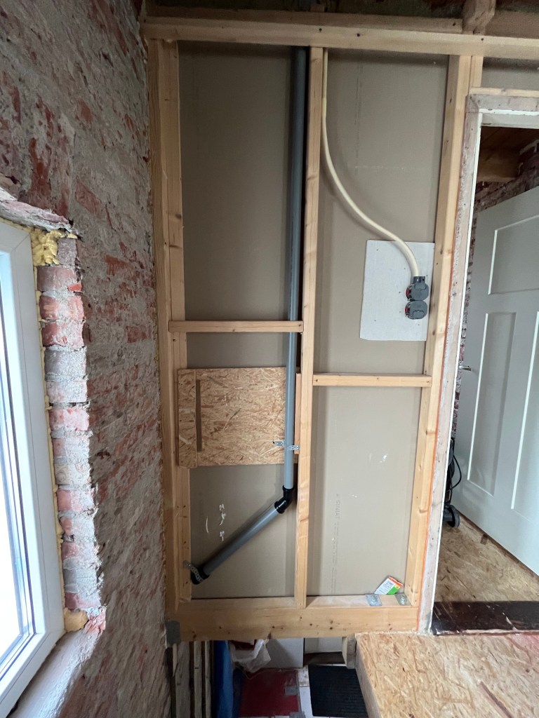 De beluchting van de afvoer (zodat de boel niet vacuüm trekt als je wat wegspoelt) is al voorbereid, en die gaat door het binnenmuurtje van boven naar beneden.