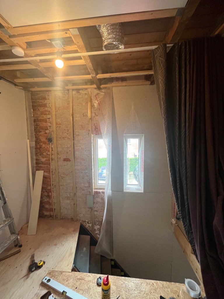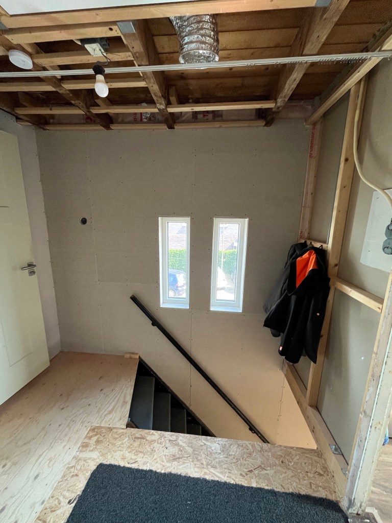 Na een korte rustpauze is het klussen rustig aan weer begonnen. De gang was het laatste stuk eerste verdieping dat nog niet geïsoleerd en afgewerkt was, en zag er zo uit.